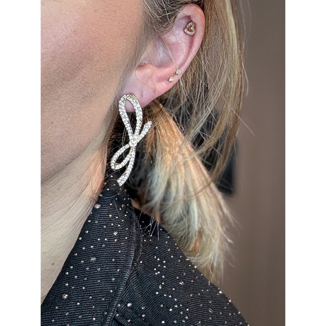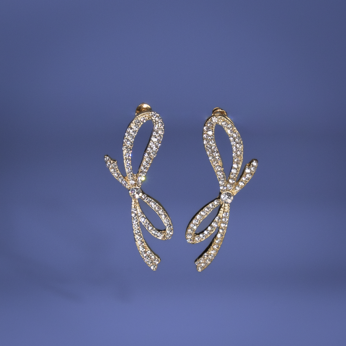 Smukke gyldne øreringe med sten og formet som en sløjfe.