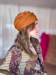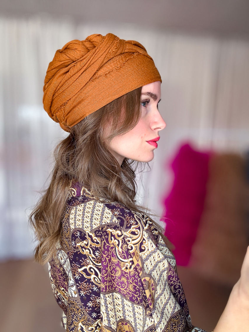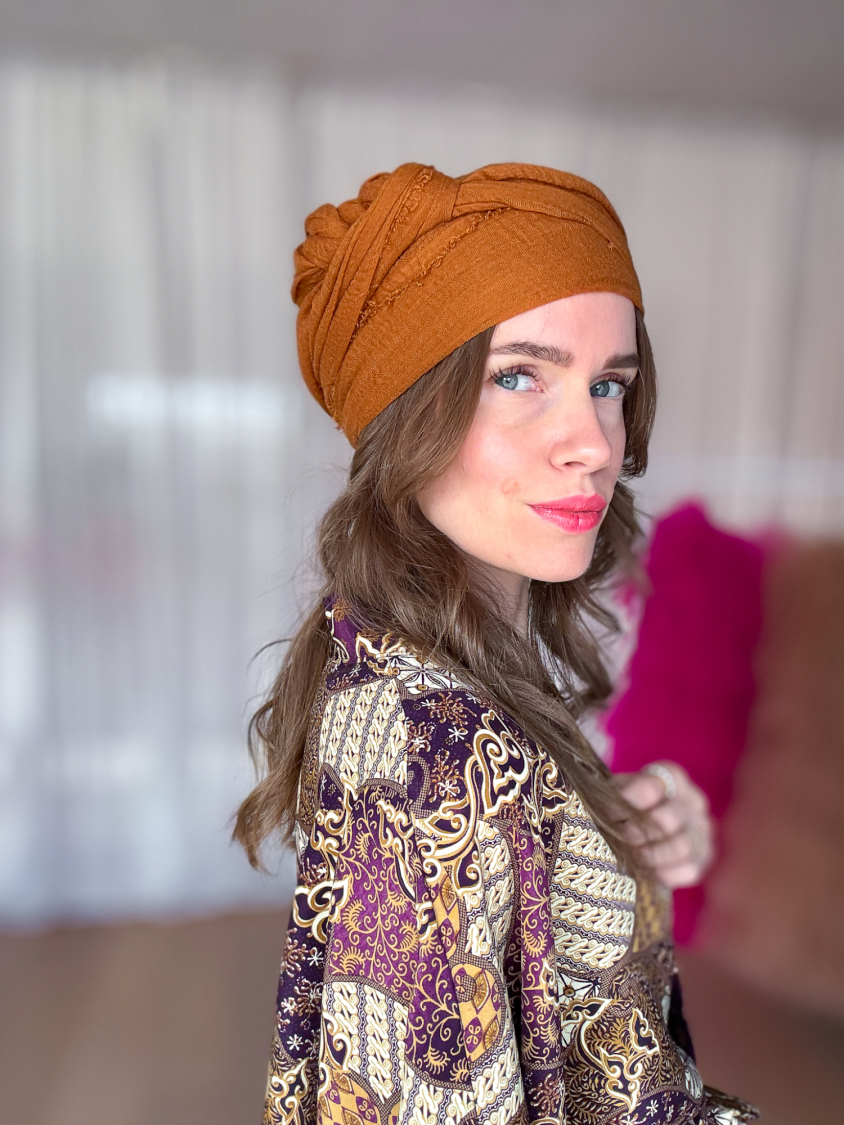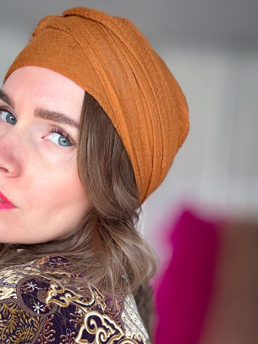Bomuldstørklæde i orange brugt som hårbånd