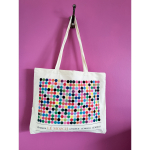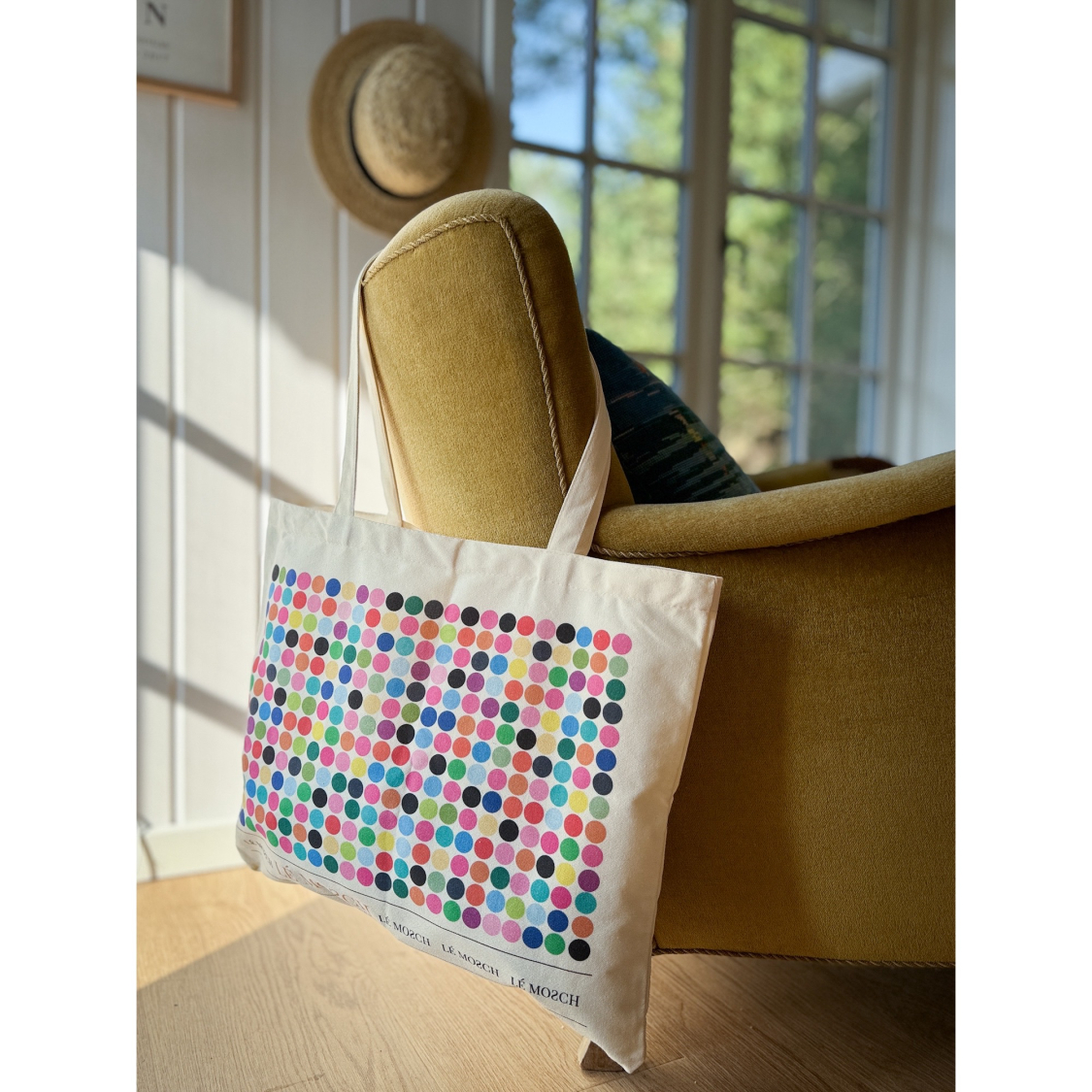 LE MOSCH logo taske med Multi Prikker. Logo tasken er lavet af kraftig canvas og med stor hank. Vi forsøger at reducerer behovet for engangsplastik ved at tilbyde en holdbar alternativ til plastikposen.
