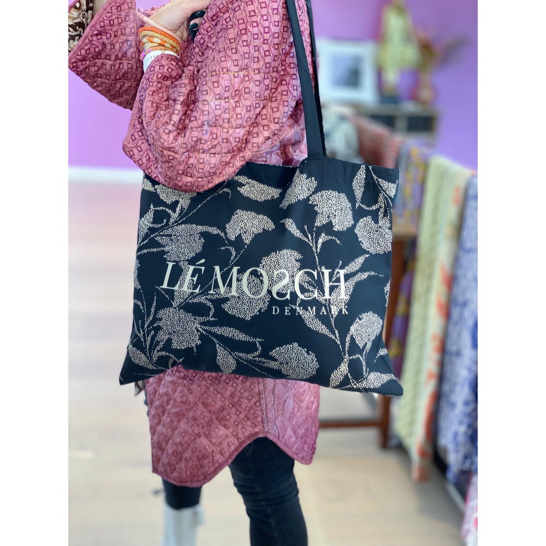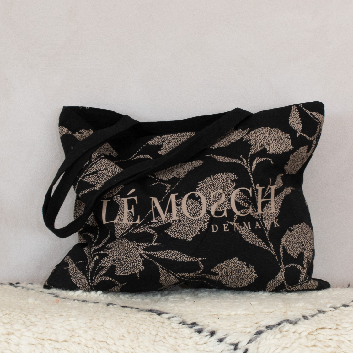 LE MOSCH logo taske i Sort Grafisk. Logo tasken er lavet af kraftig canvas og med stor hank. Vi forsøger at reducerer behovet for engangsplastik ved at tilbyde en holdbar alternativ til plastikposen.