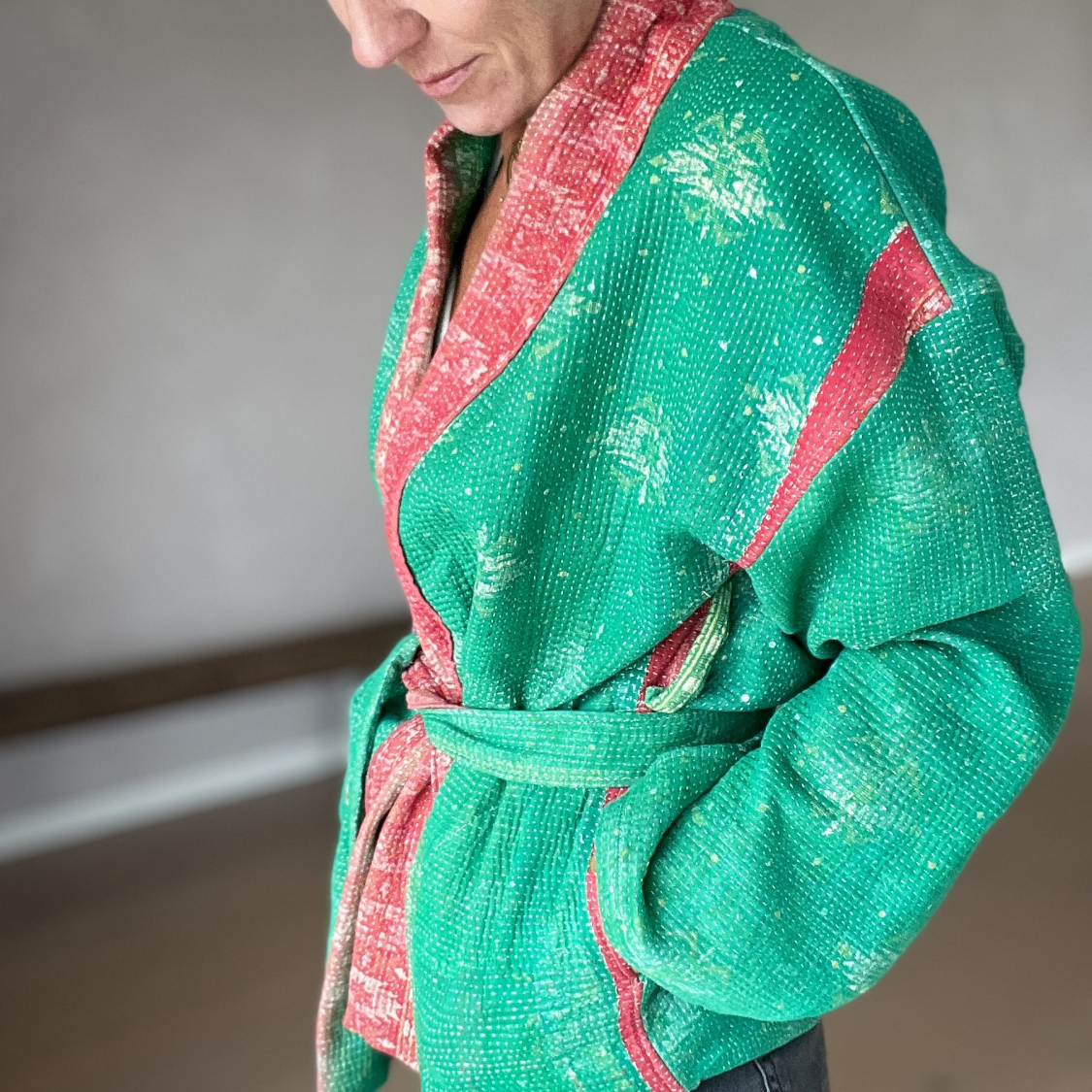 One size vendbar jakke med knapper og bælte, syet i unik indisk vintage Kantha quilt. Materialet er håndlavet samt genanvendt, og dermed helt særligt. VIGTIGT: Læs længere nede for mere information om kvaliteten, og hvilken betydning det har når materialet er håndlavet og vintage.
