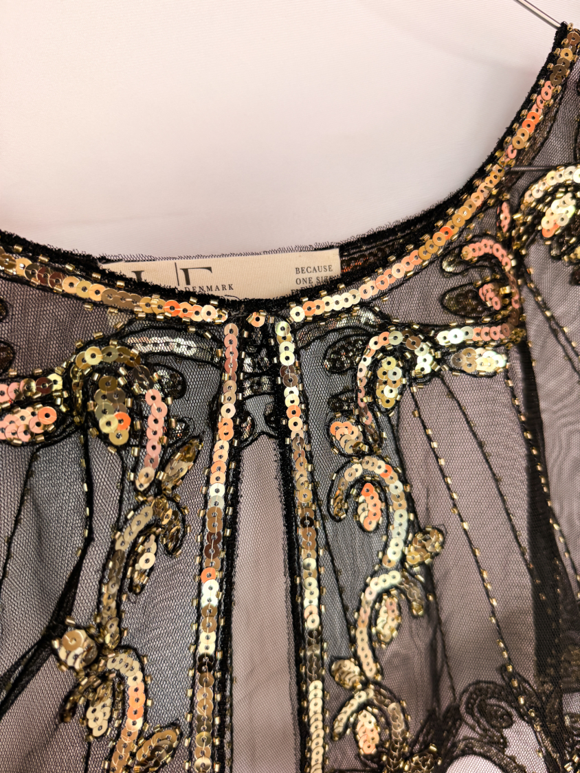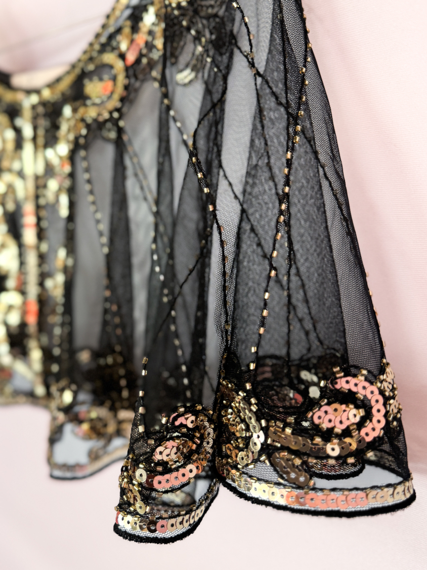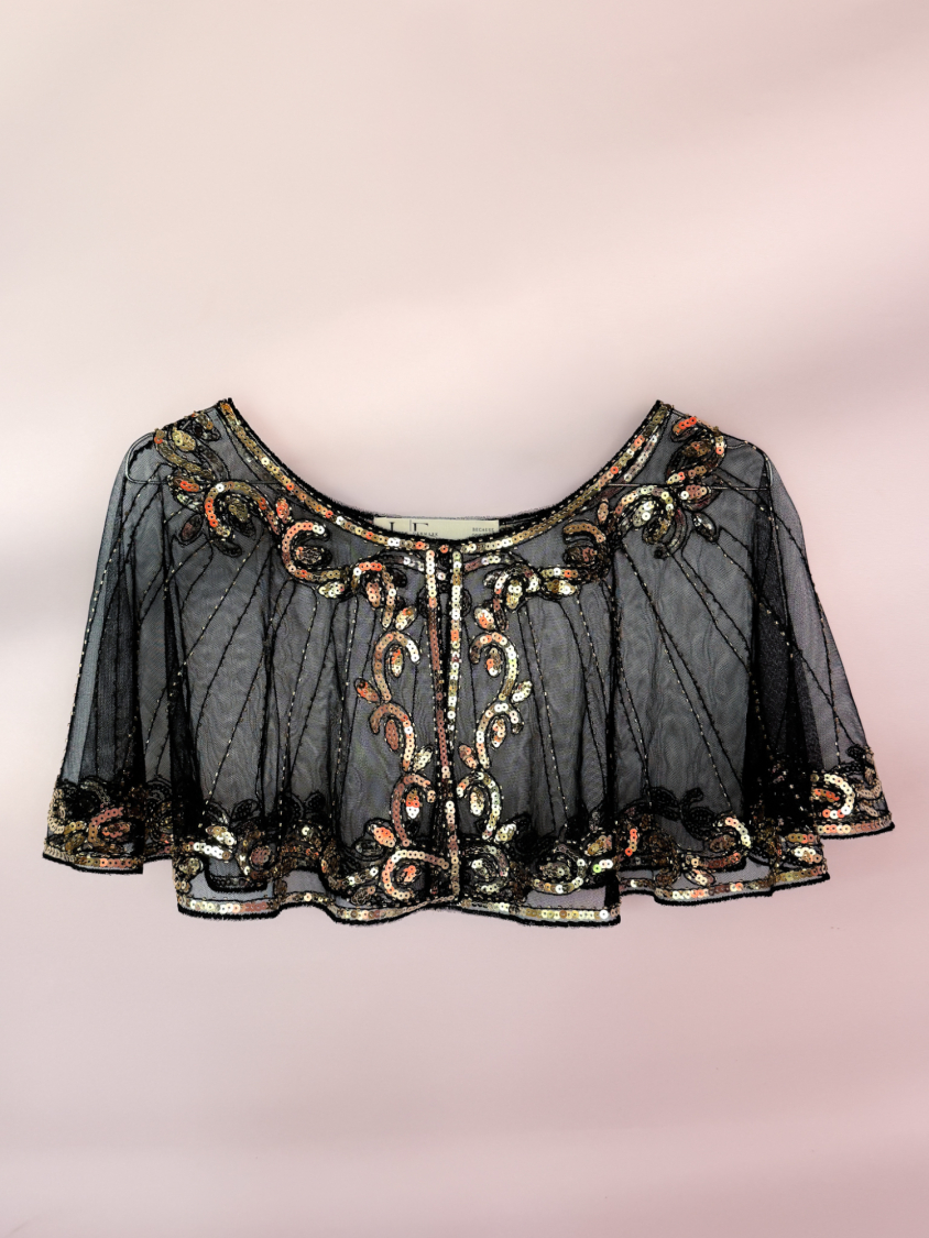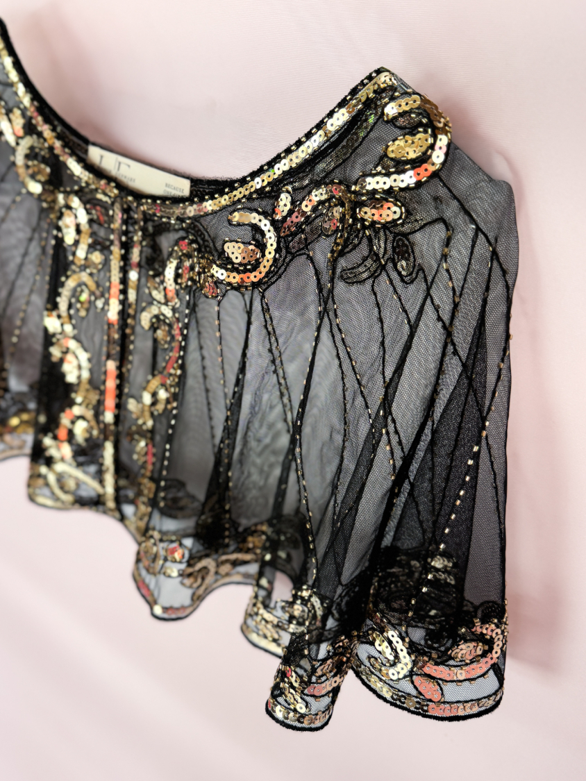 Kate kappe i sort og gylden fra LÉ MOSCH, fin sort og guldfarvet pyntekappe til dit festlook, yndig og let skulderdækning til festen,