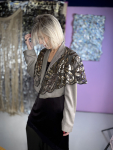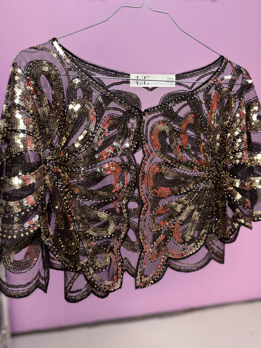 Kate kappe i sort og gylden fra LÉ MOSCH, fin sort og guldfarvet pyntekappe til dit festlook, yndig og let skulderdækning til festen,