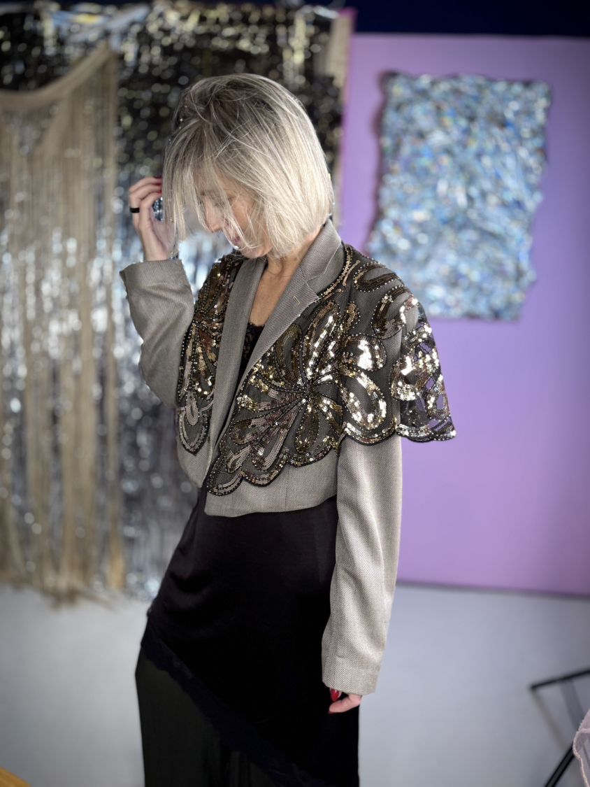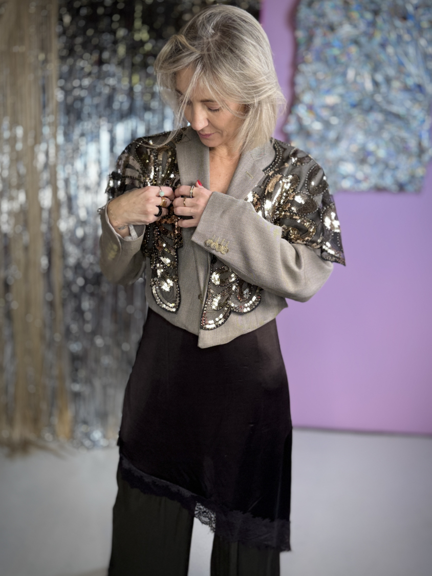 Vintage Vibes mørkegrå blazer med bælte – No 164 fra LÉ MOSCH, skøn og super anvendelig secondhand blazer,