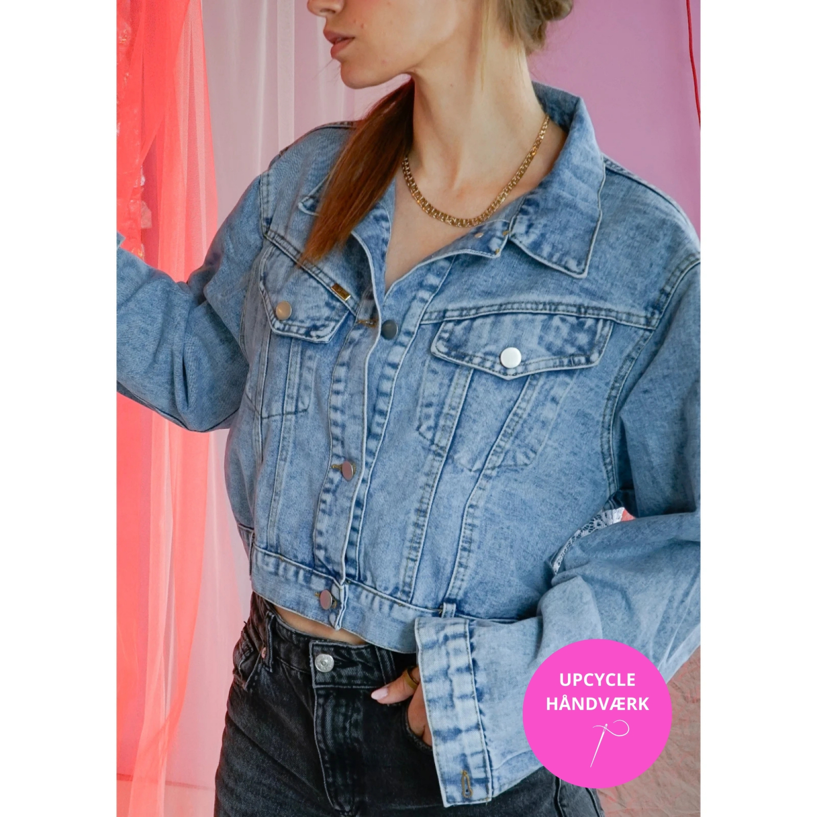 Foran er den helt basic, som en klassisk kort lyseblå denimjakke, og bagpå er ryggen dækket af sorte blonder og vores logo. Det lyse denimstof sammen med sorte blonder er et fantastisk match. Det giver et SUPER fedt look, hvis du spørger os. Denne her jakke er cool og anderledes uden at være alt for vild. Den er god både indendørs og udendørs.