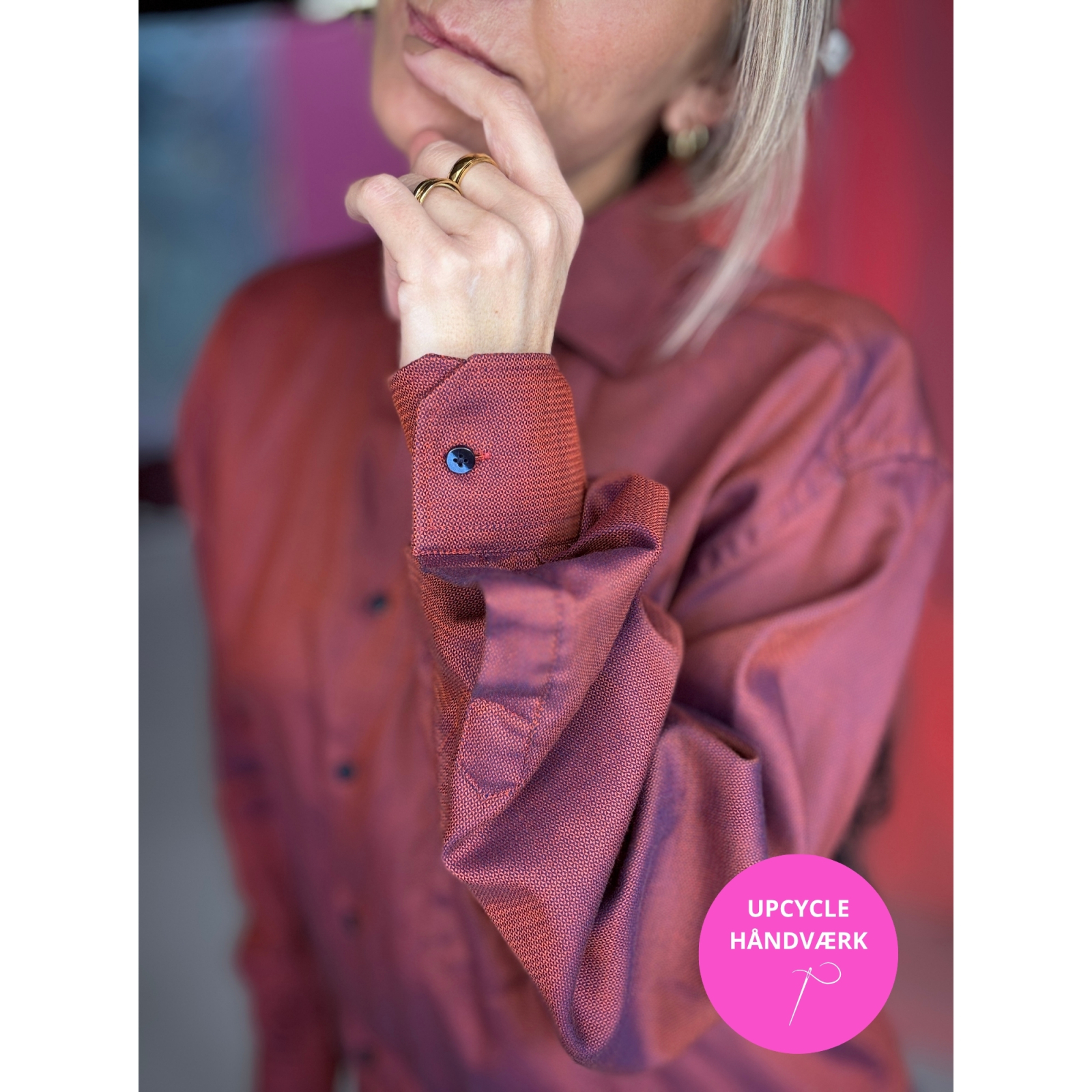 Skjorten er upcyclet og har fået nyt liv gennem kærlig syning. - Ikke af professionelle syersker på en fabrik men af vores egne selvlærte menneskehænder med passion for unikke detaljer. Det er kreativt håndværk og ikke maskin-perfektion. Perfekt uperfekt - ligesom alt det smukkeste i livet.