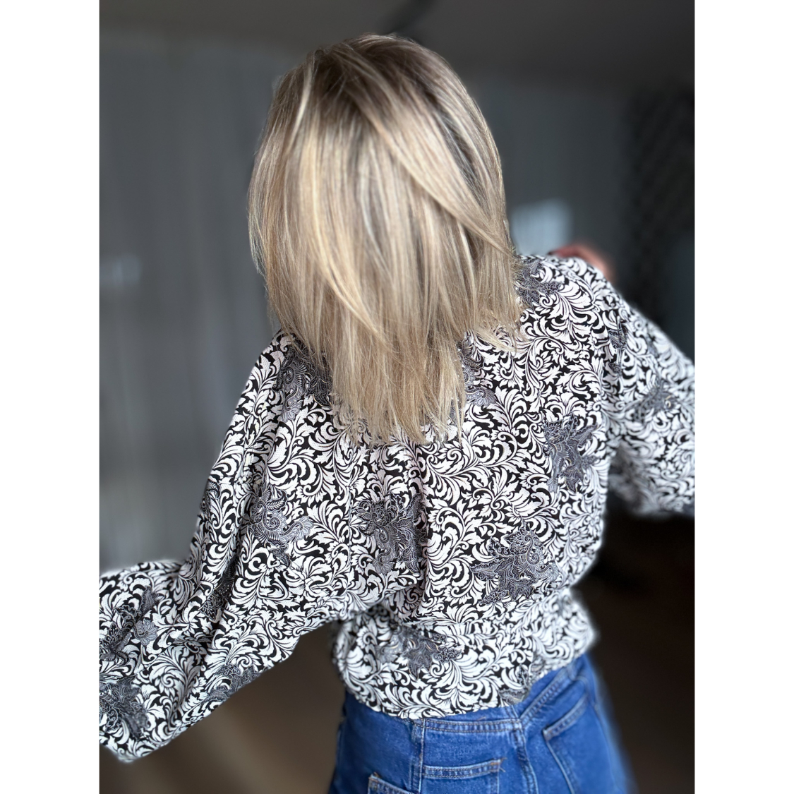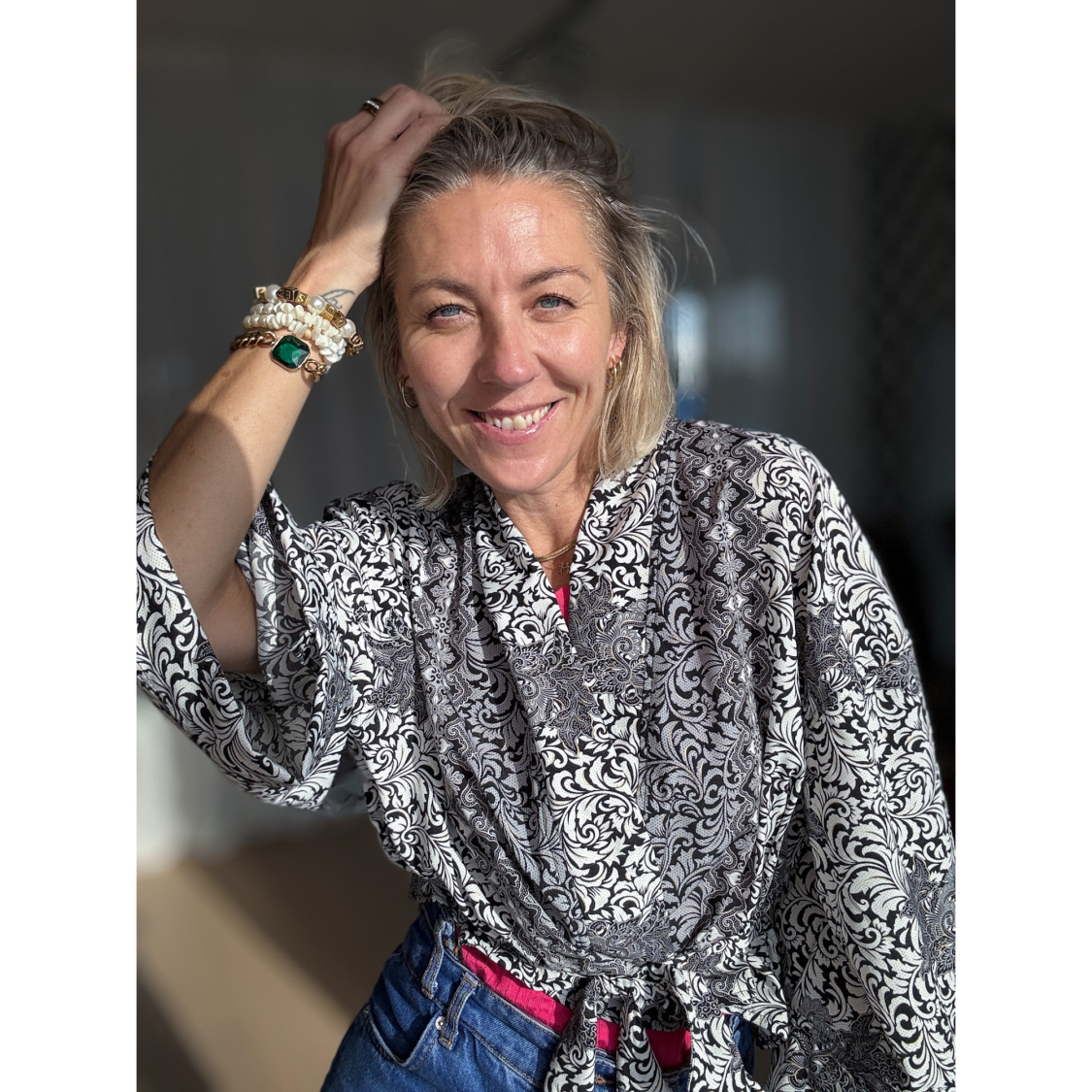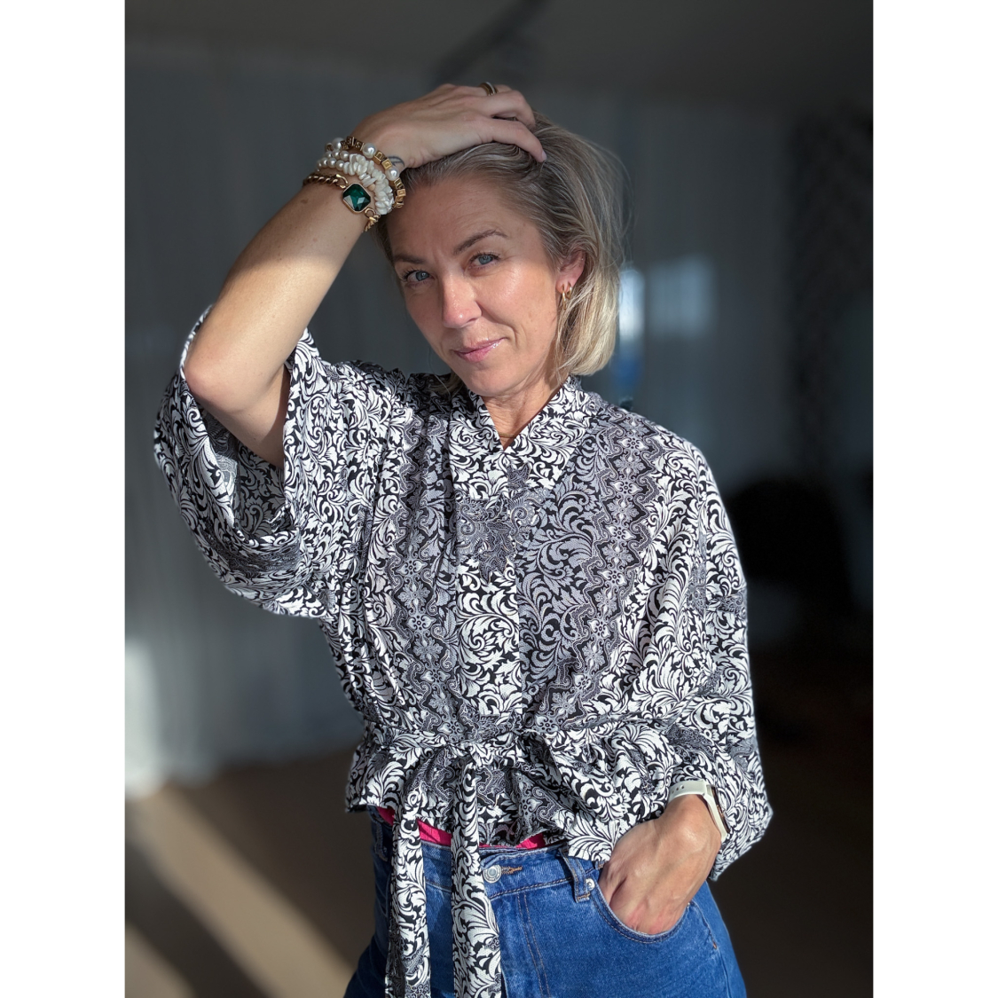 Maria Kimono Kort no 393 Sort Hvid fra LÉ MOSCH, håndlavet Maria Kimono i sort og hvidt mønster, festlig kort kimono med trekvarte ærmer og bælte,