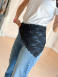 Sort blonde slå-om nederdel stylet over lyse bukser – feminin og cool style fra Lé Mosch