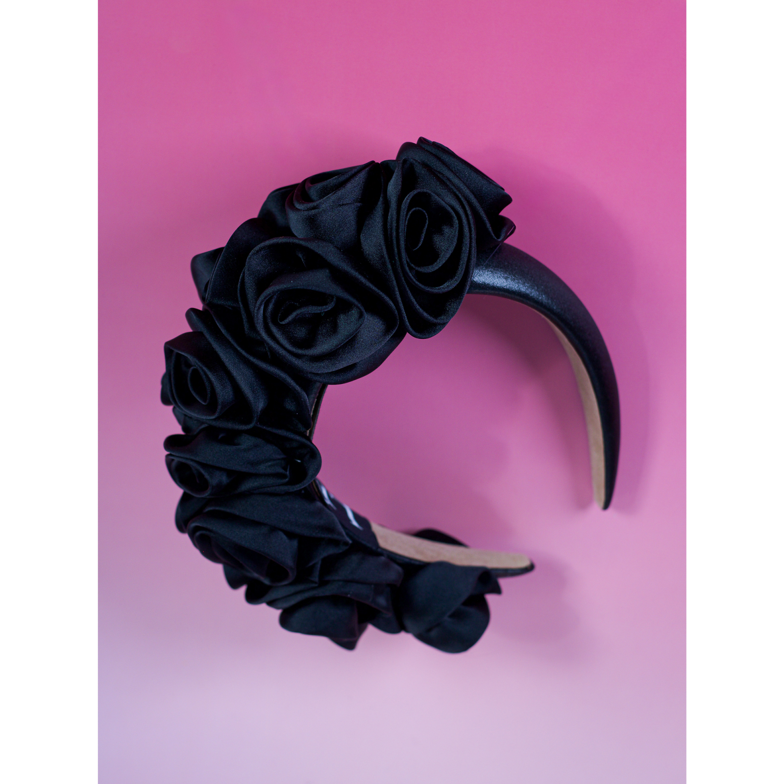 Smuk og super iøjnefaldende håndlavet blomsterkrone med sorte satin stof blomster på en sort hårbøjle.
