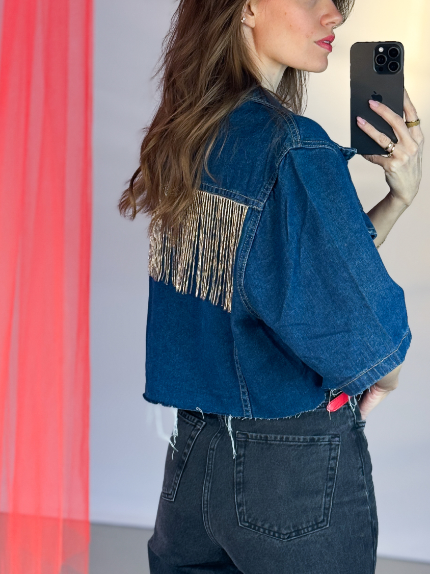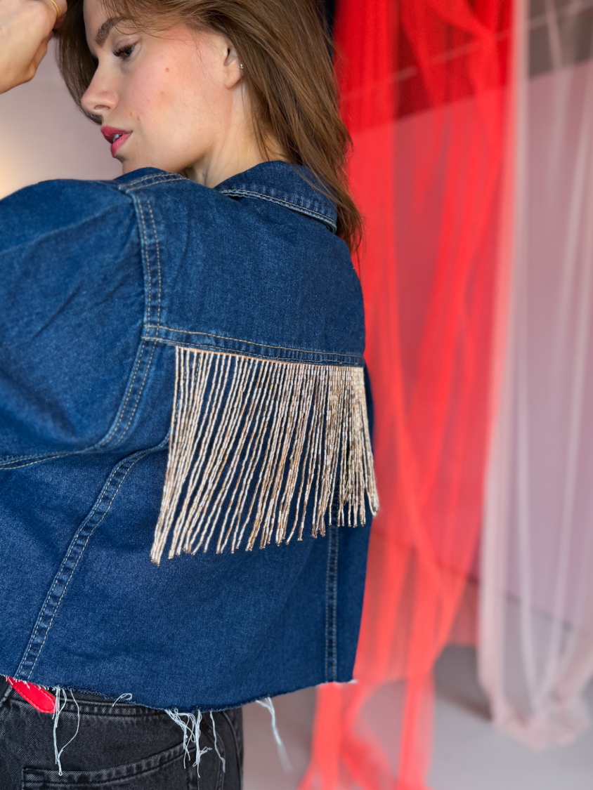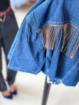 Vintage Vibes blå denim jakke med frynser og patch – no 129