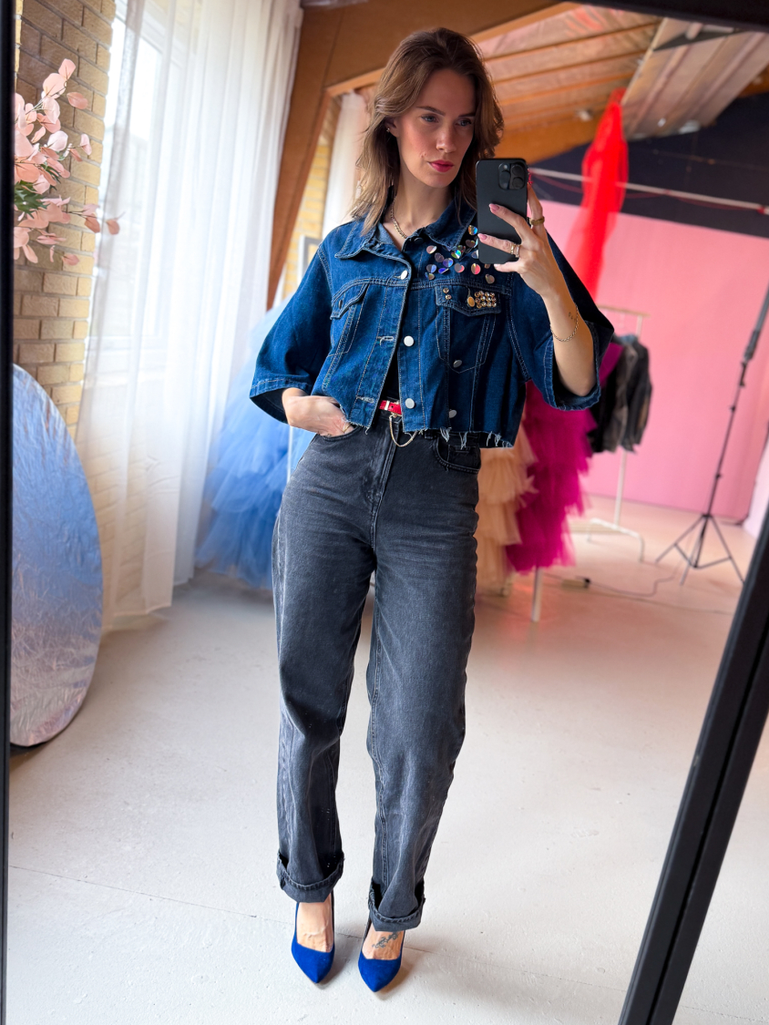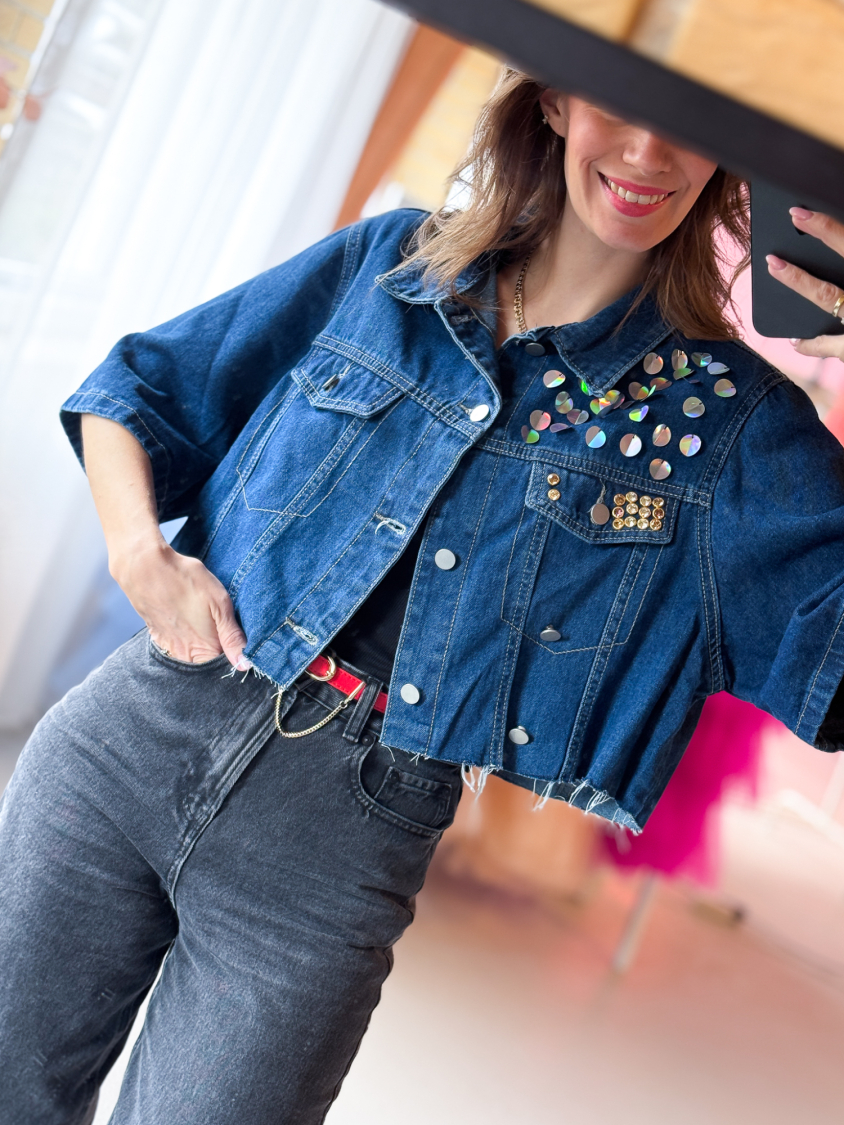 Vintage Vibes blå dekoreret denim jakke – no 184 fra LÉ MOSCH, anderledes jakke eller skjorte i denim, kort jakke med korte ærmer og frynser,