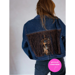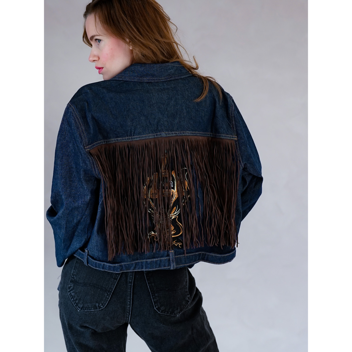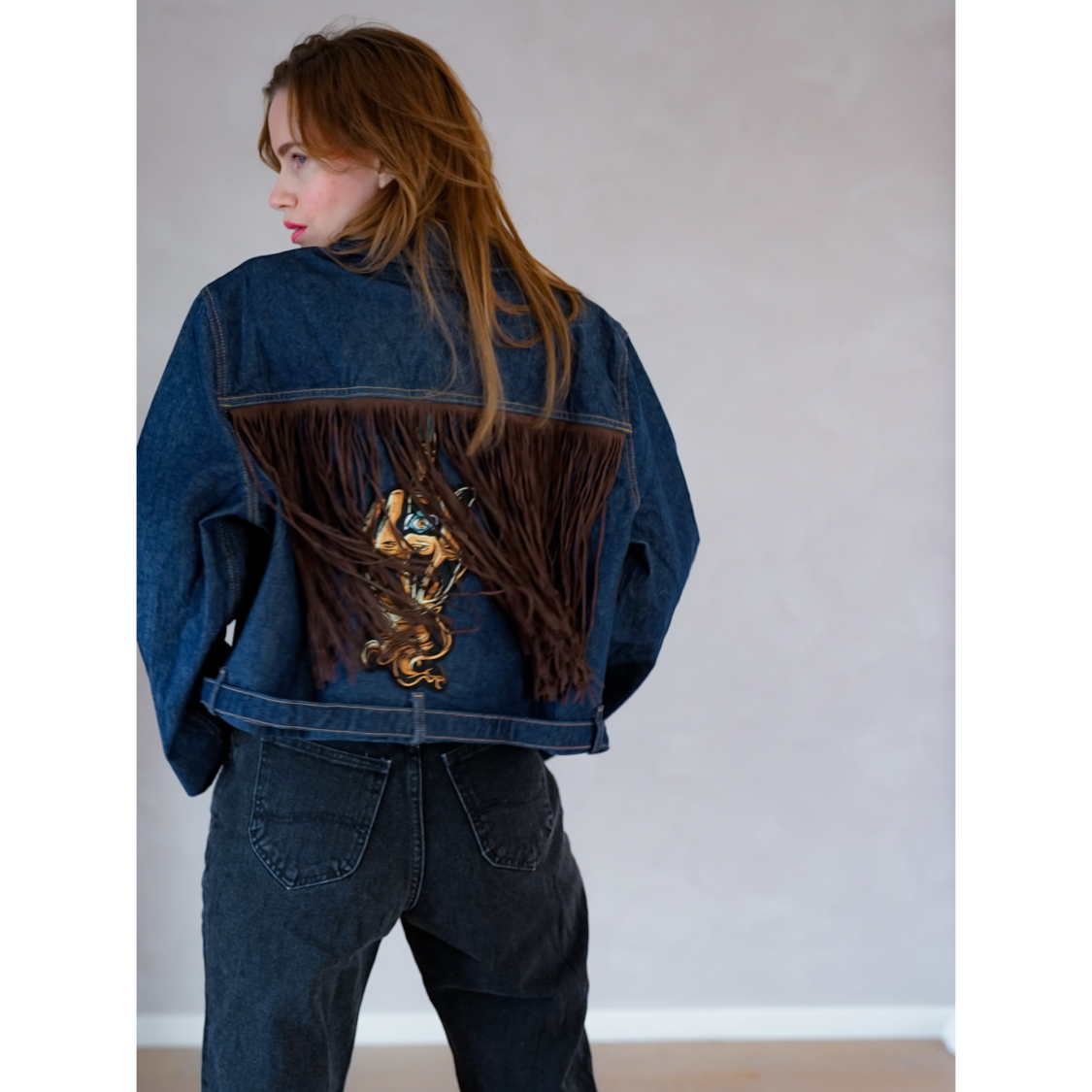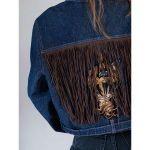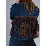 Forsiden / Tøj / Tøj / Vintage Vibes blå denim jakke med frynser og patch – no 129
