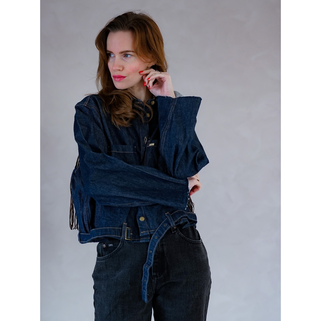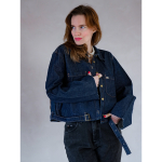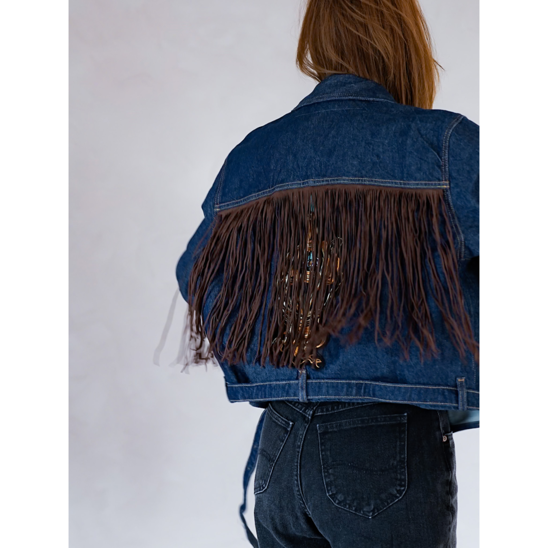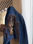 Vintage Vibes blå denim jakke med frynser og patch – no 129