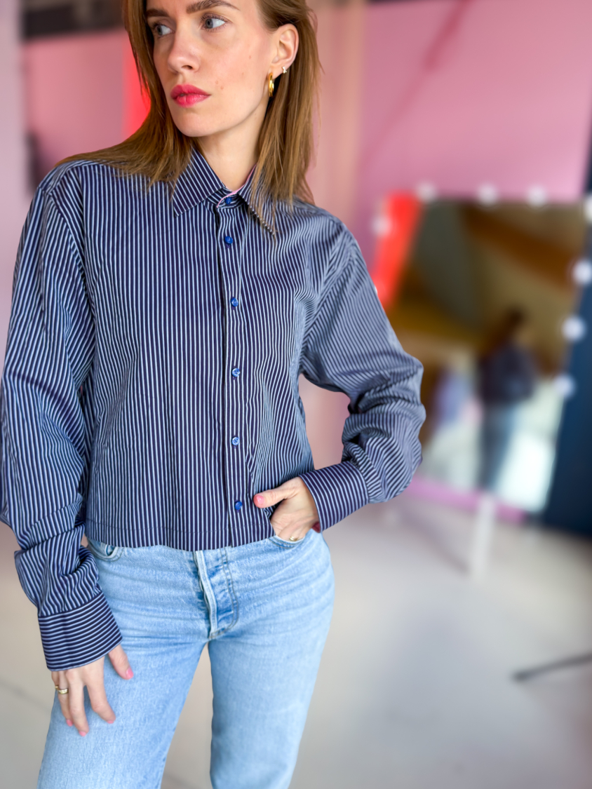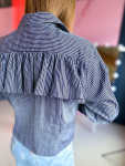 Vintage Vibes blå skjorte med flæse - No 188 fra LÉ MOSCH, Smuk og spændende kort blå skjorte, skjorte med flæse og lange ærmer,