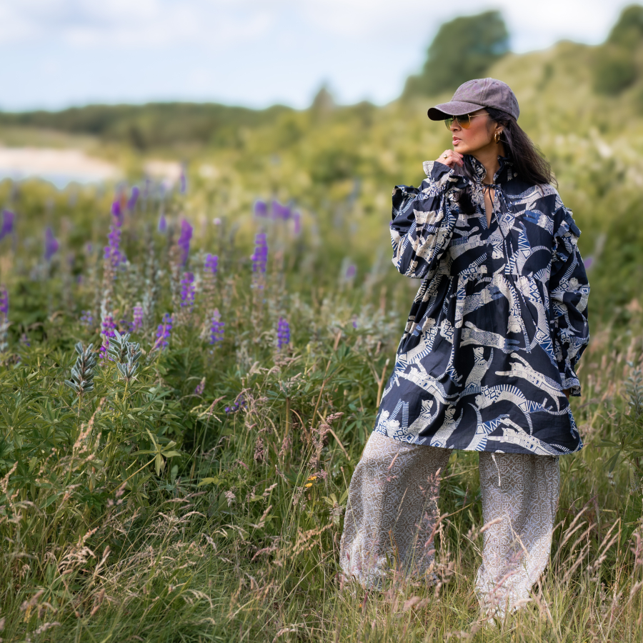Alpana kjole no 88 fra LÉ MOSCH, farverig oversize kjole, unika kjole af genbrugsmaterialer,
