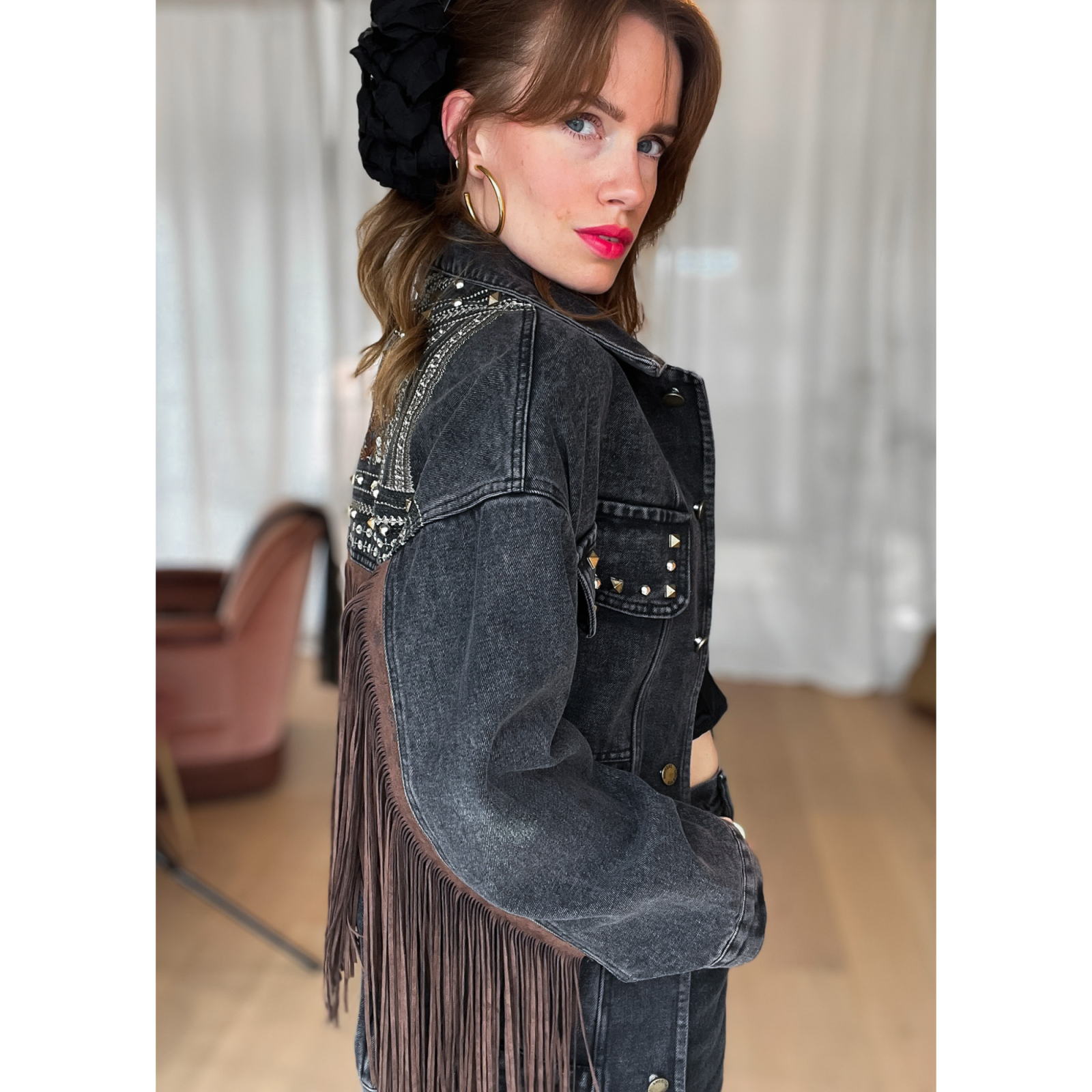 ✔ Dekoreret med frynser på ryggen, nitter og broderi