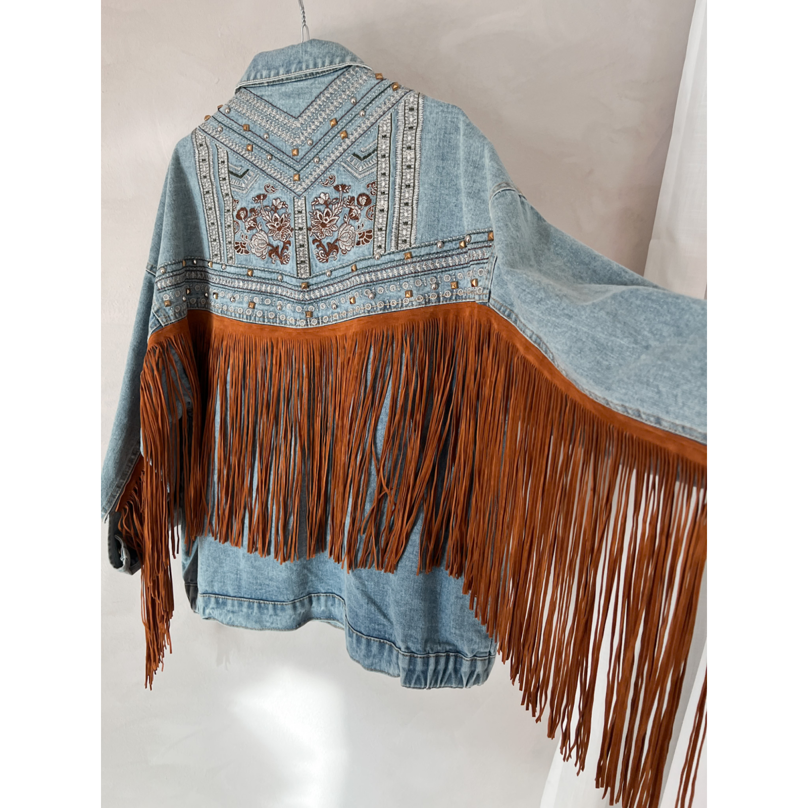 Denne virkelig skønne lyse denim jakke er så cool med den broderede ryg og de fine nitter. Og ikke mindst de lange brune frynser, som sidder både på ryggen og langs ærmerne! De giver et vildt fedt look! Jakken er iøjnefaldende men også super anvendelig og faktisk super populær!