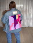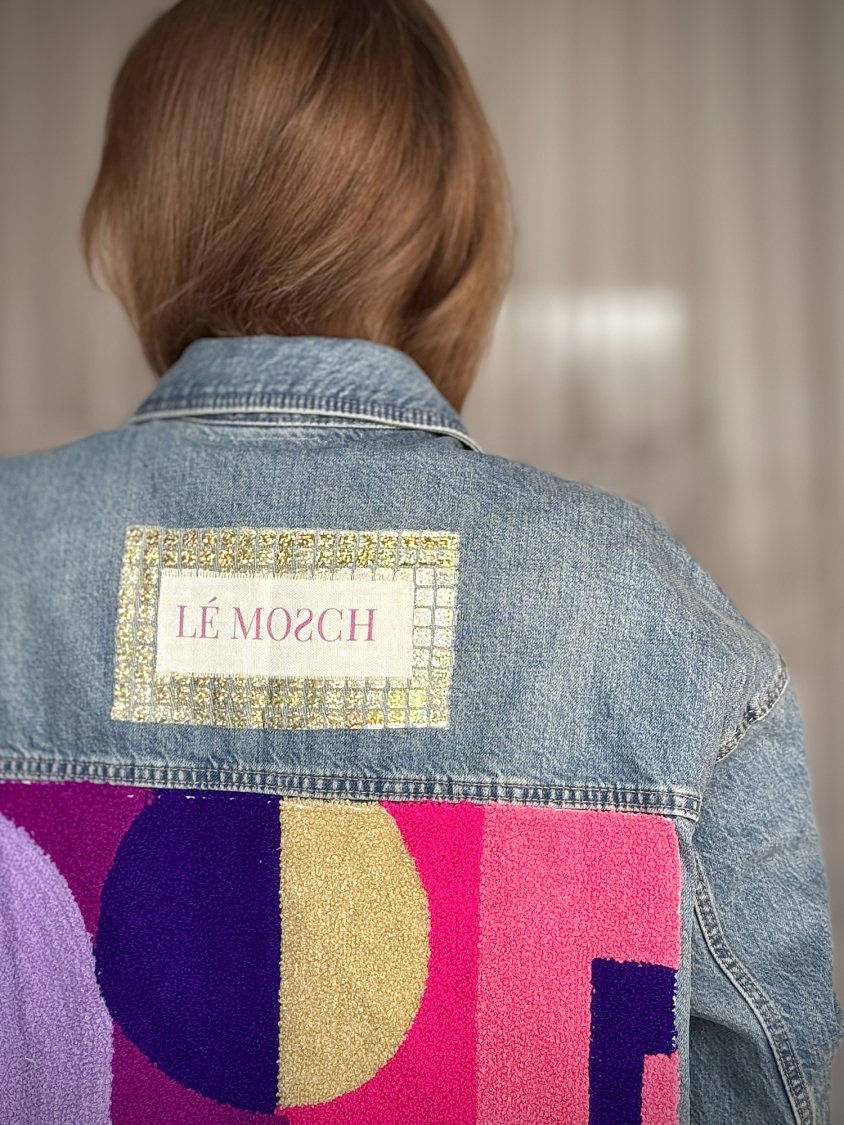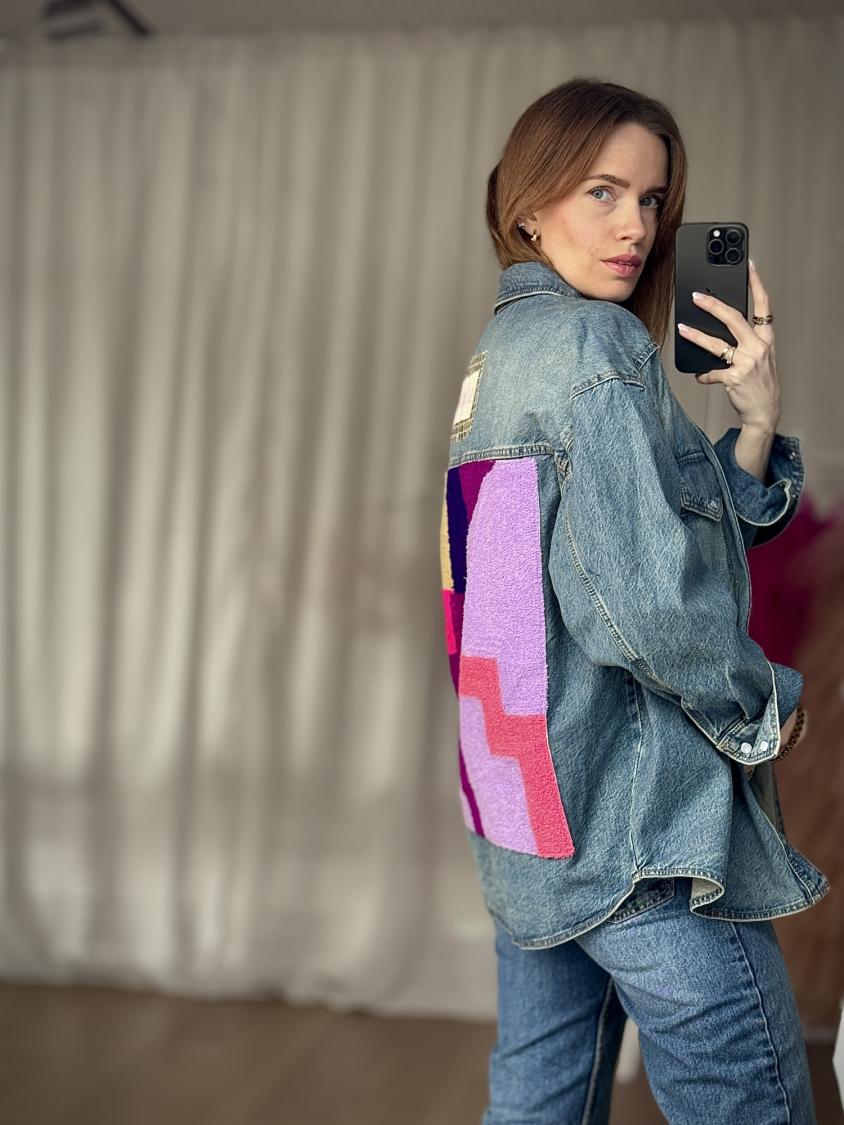 Vintage Vibes denimskjorte med stor patch – no 169 fra LÉ MOSCH, super anvendelig og anderledes denimskjorte, skjorte med stor blød og farverig patch på ryggen,
