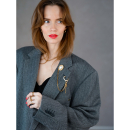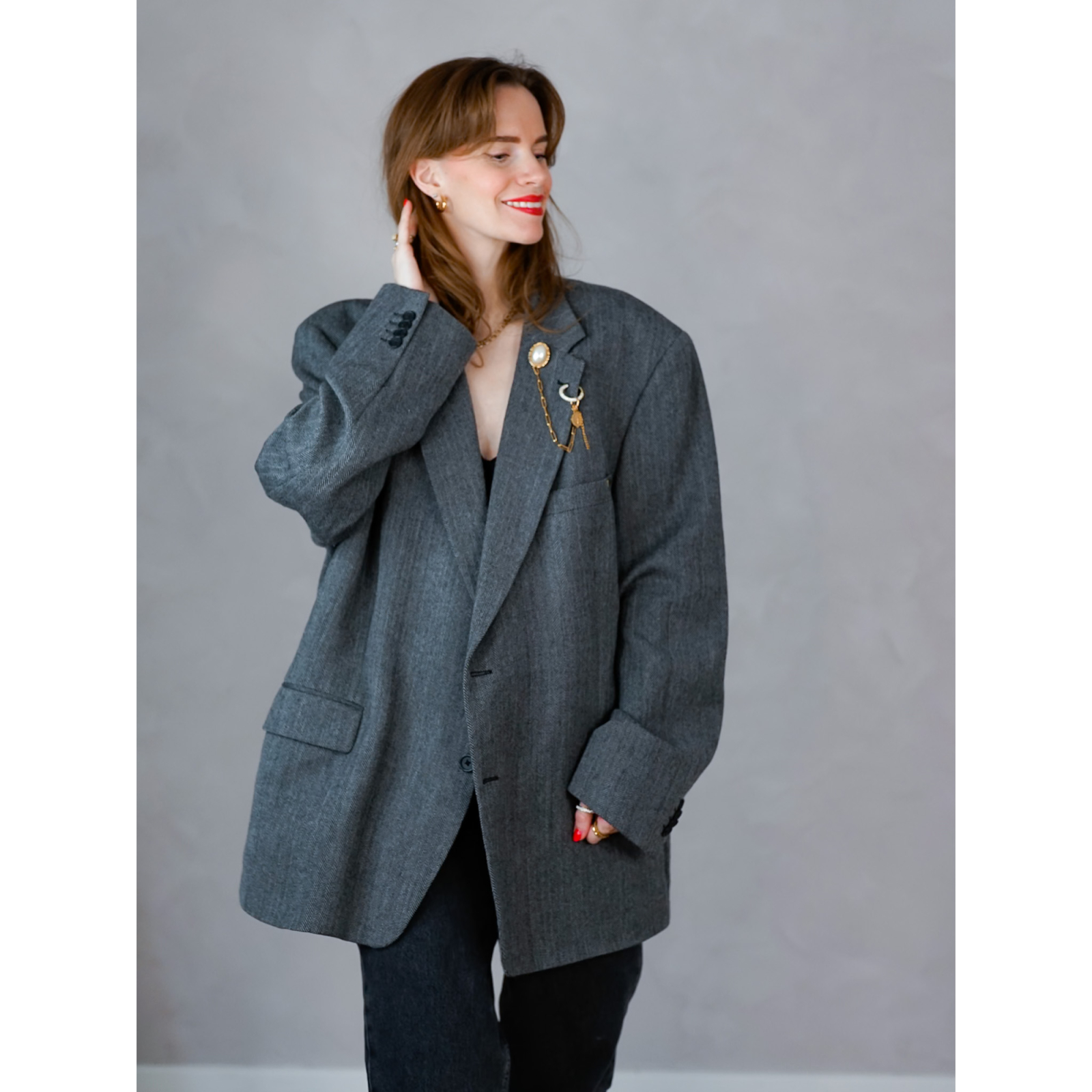 Denne secondhand blazer er ret enkel, og den grå farve går jo nærmest til alt. Vi har pyntet den med en dekorativ broche med kæde. Det giver blazeren en lidt finere og mere sofistikeret vibe. Du kan selvfølgelig tage kæden og brochen af, og sætte det på noget andet lækkert i dit klædeskab.