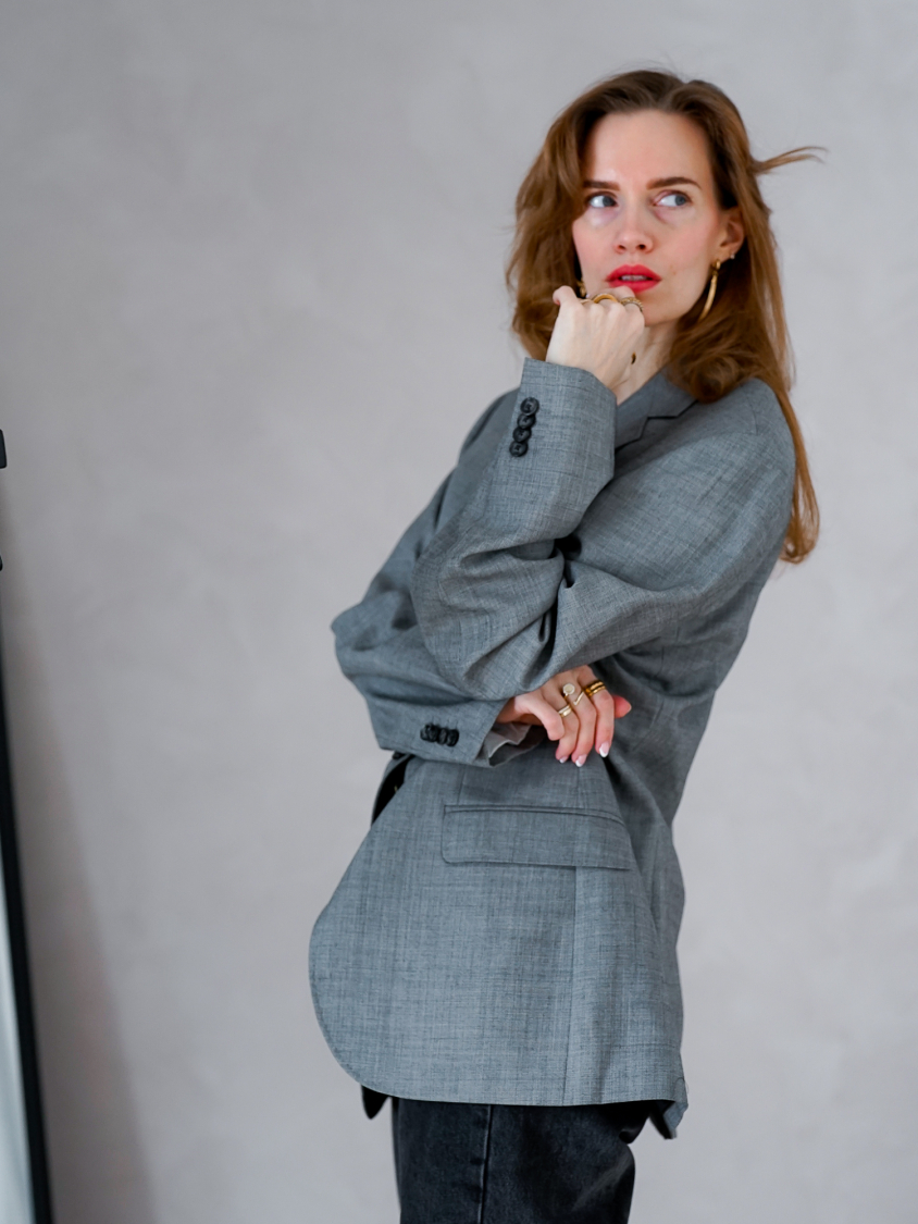 Vintage Vibes grå blazer med broche – No 157 fra LÉ MOSCH, skøn grå blazer med feminin brochekæde, unik og enkel grå oversize blazer,