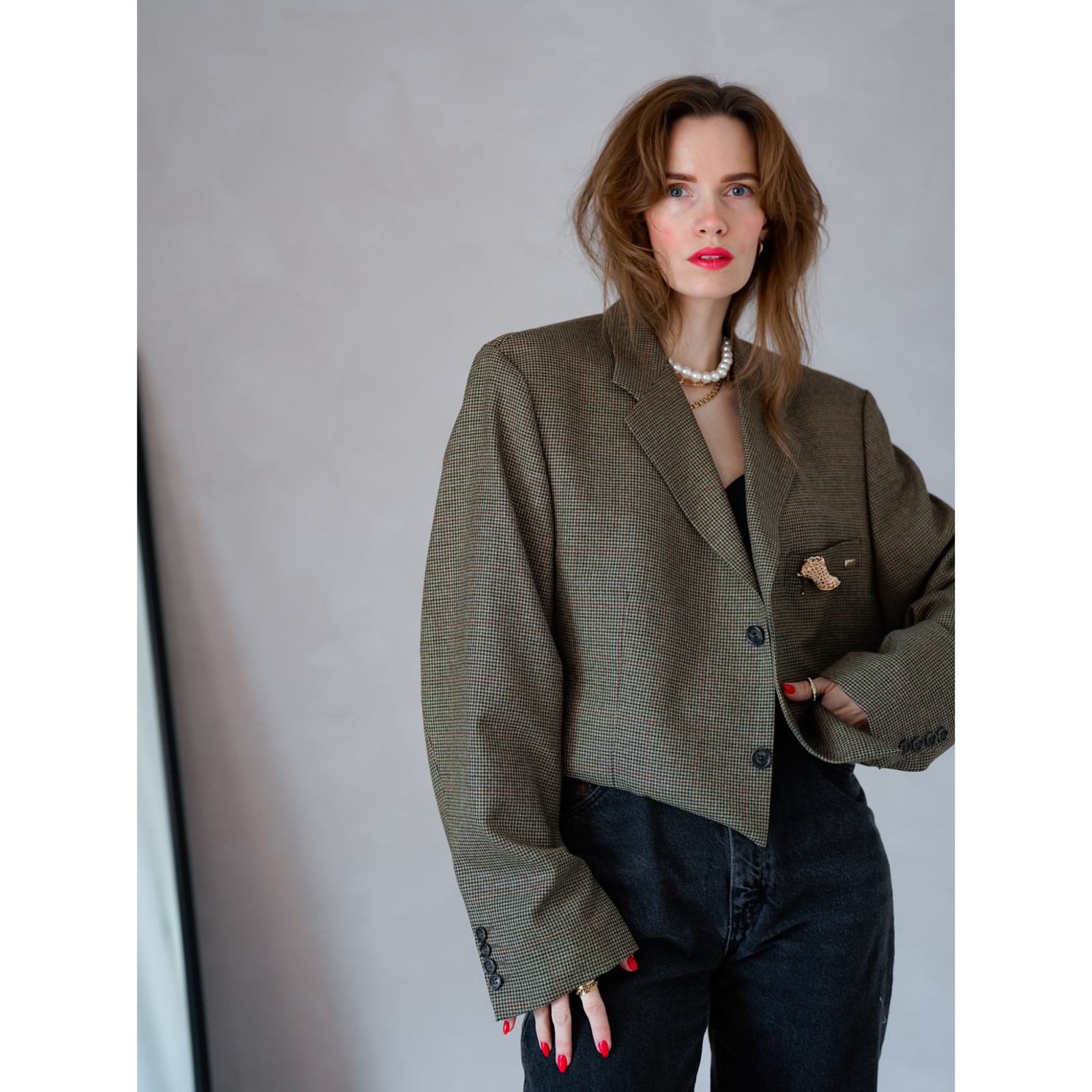 Vi elsker blazerjakker og vi er blevet ret vilde med korte blazere! De har en fed skulpturel silouet og er generelt bare virkelig stilfulde! Vi har redesignet denne skønne blazer, som du kan style på utallige måder. Den er perfekt over en t-shirt eller en sweatshirt, men du kan også bruge den til en kjole eller en fin top. Blazeren er overvejende grøn med lidt rødt og blåt. Den har to knapper foran, og så får du den fine STILET BROCHE med i købet!