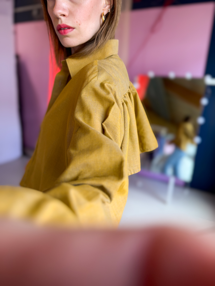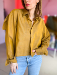 Vintage Vibes karryfarvet skjorte med flæse - No 189 fra LÉ MOSCH, smuk og spændende kort karryfarvet skjorte, skjorte med flæse og lange ærmer,