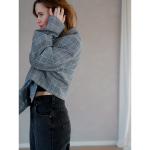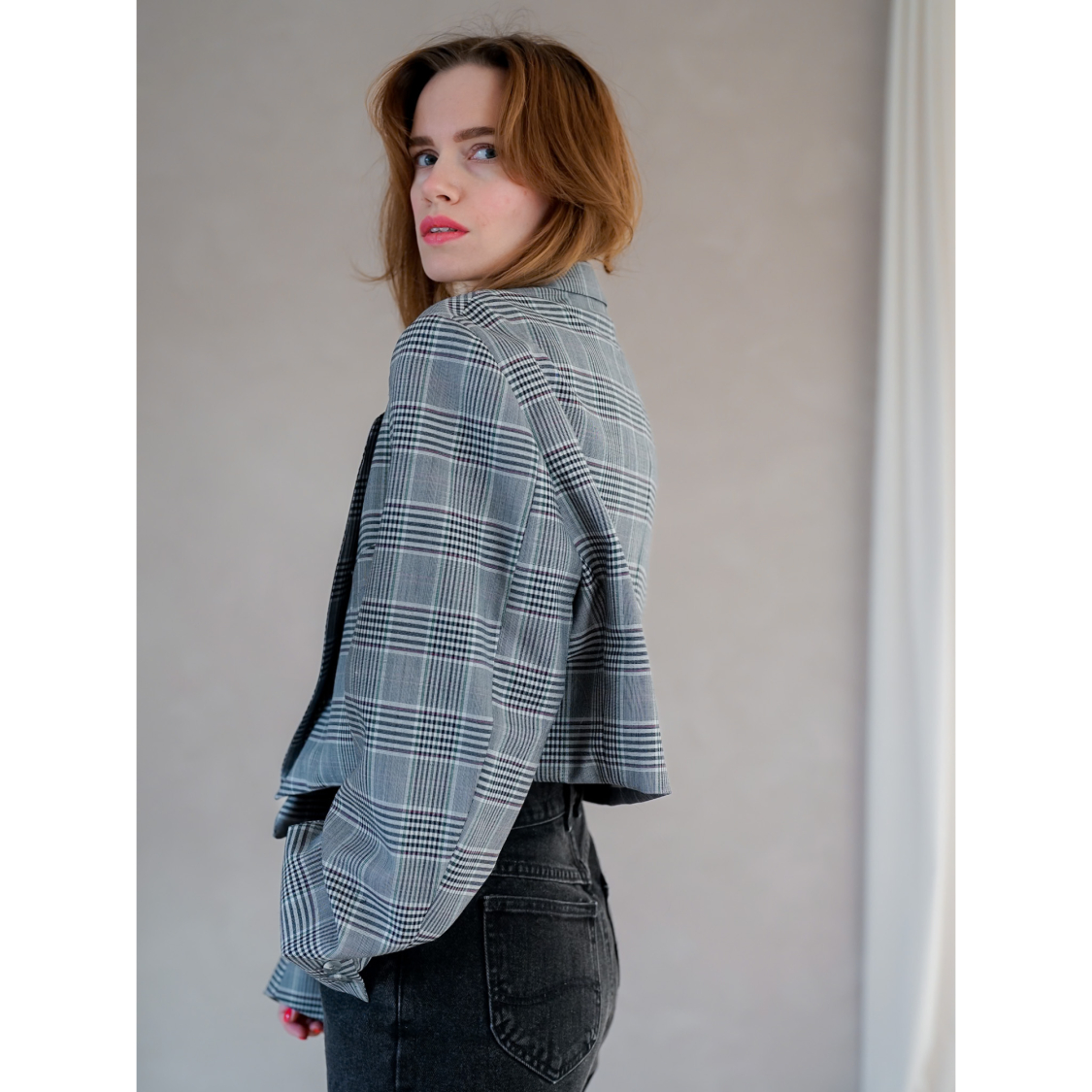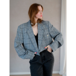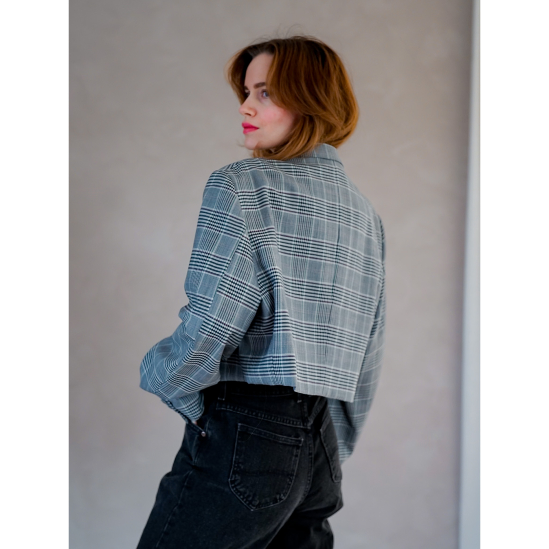 Vintage Vibes Kort Blazer med store tern – No 134 fra LÉ MOSCH, smuk skulpturel kort blazer med flotte tern, grå ternet kort blazer til dit personlige look,