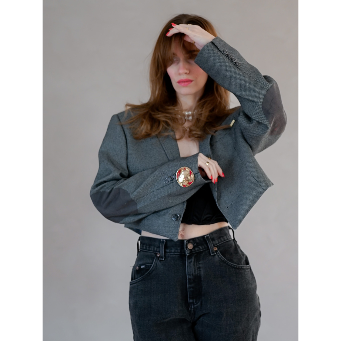 Vintage Vibes Kort Grå Blazer – No 138 fra LÉ MOSCH, smuk skulpturel kort blazer med rund gylden broche, grå kort ternet blazer til dit personlige look,