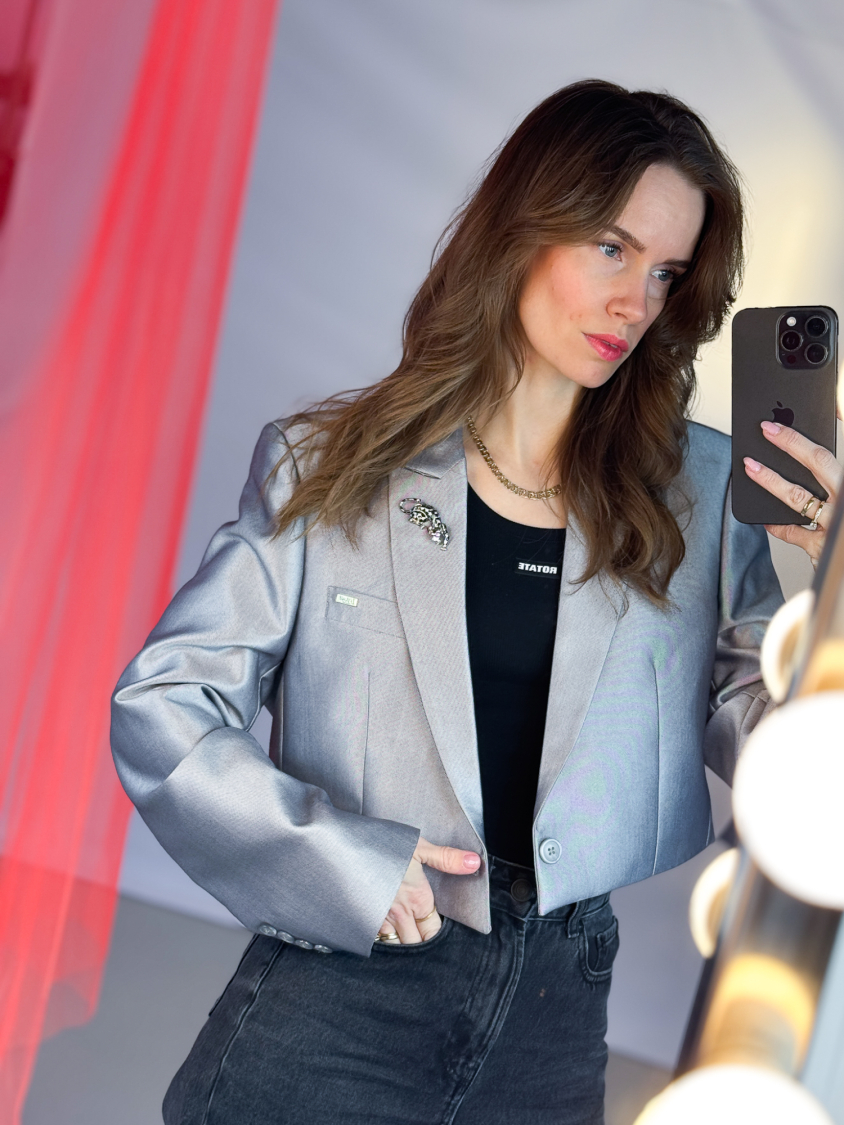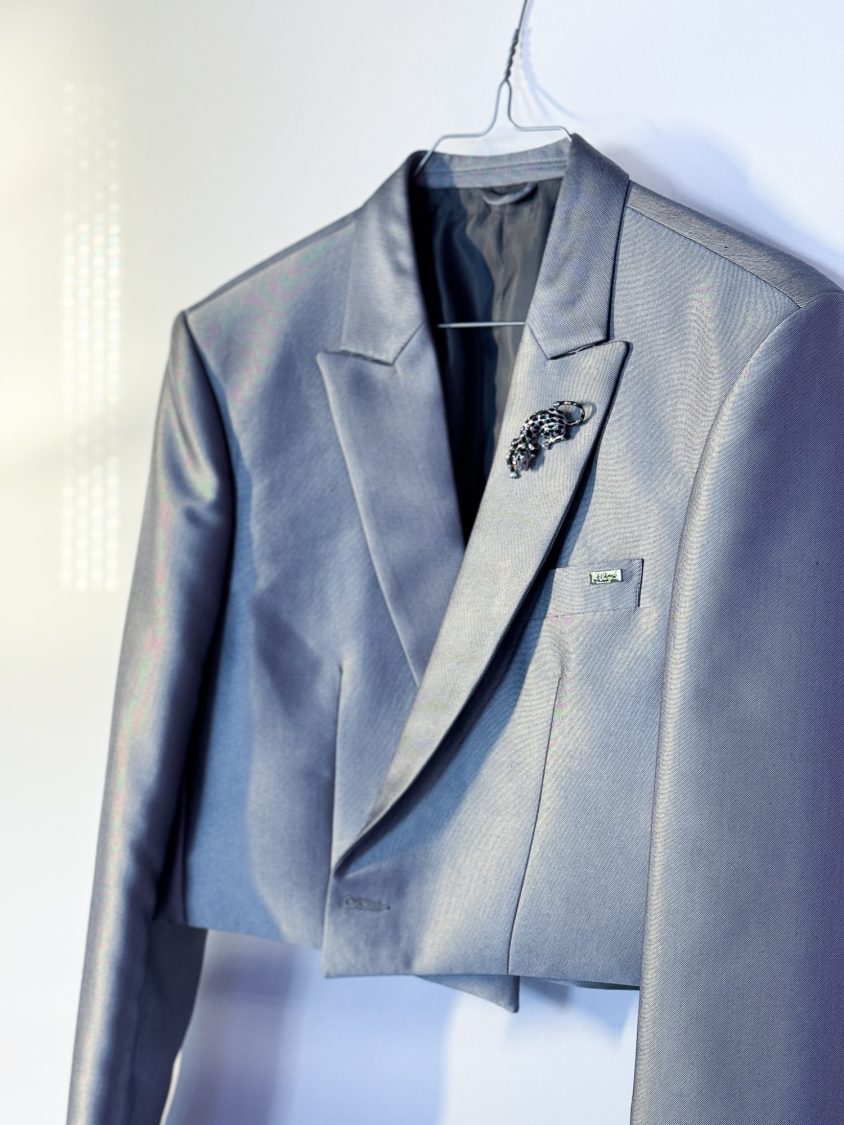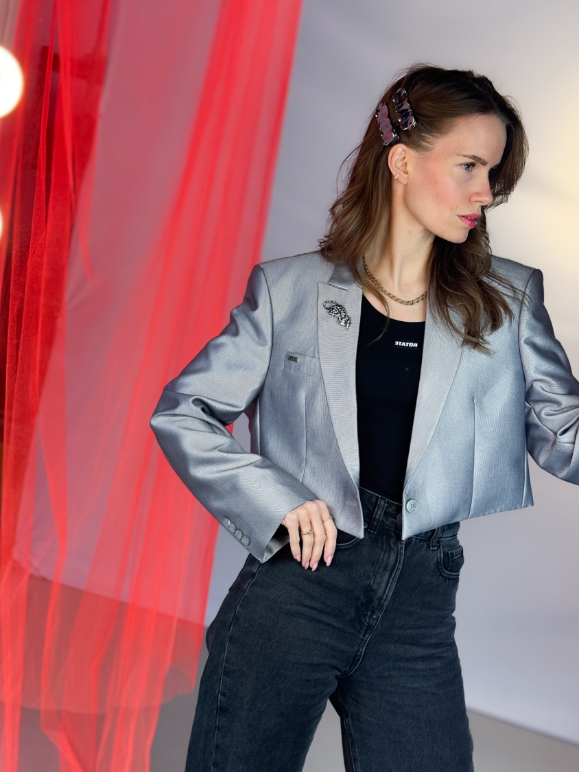 Vintage Vibes kort silver blazer – No 183 fra LÉ MOSCH, smuk skulpturel kort blazer med broche, sej kort sølvblazer til dit personlige look,