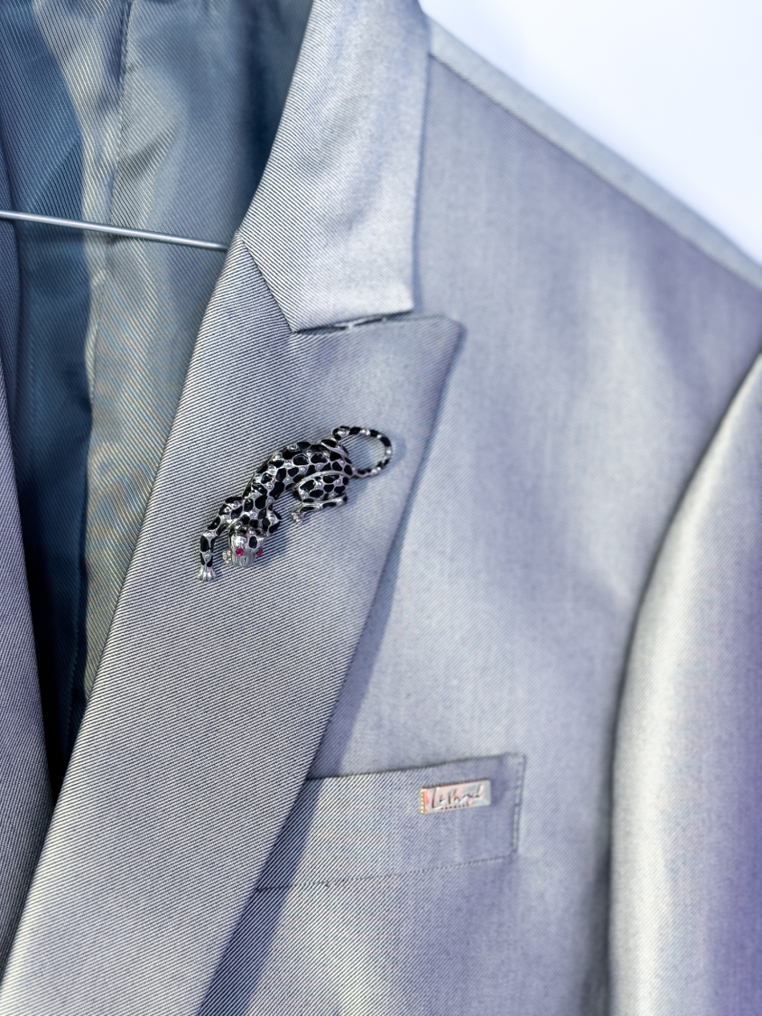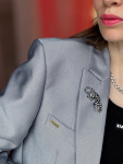 Skøn kort sølv-blazer med broche.