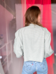 Vintage Vibes Kort Blazer med broche – No 195 fra LÉ MOSCH, smuk skulpturel kort blazer i en fin blå, redesignet blazer med fin broche til dit personlige look,