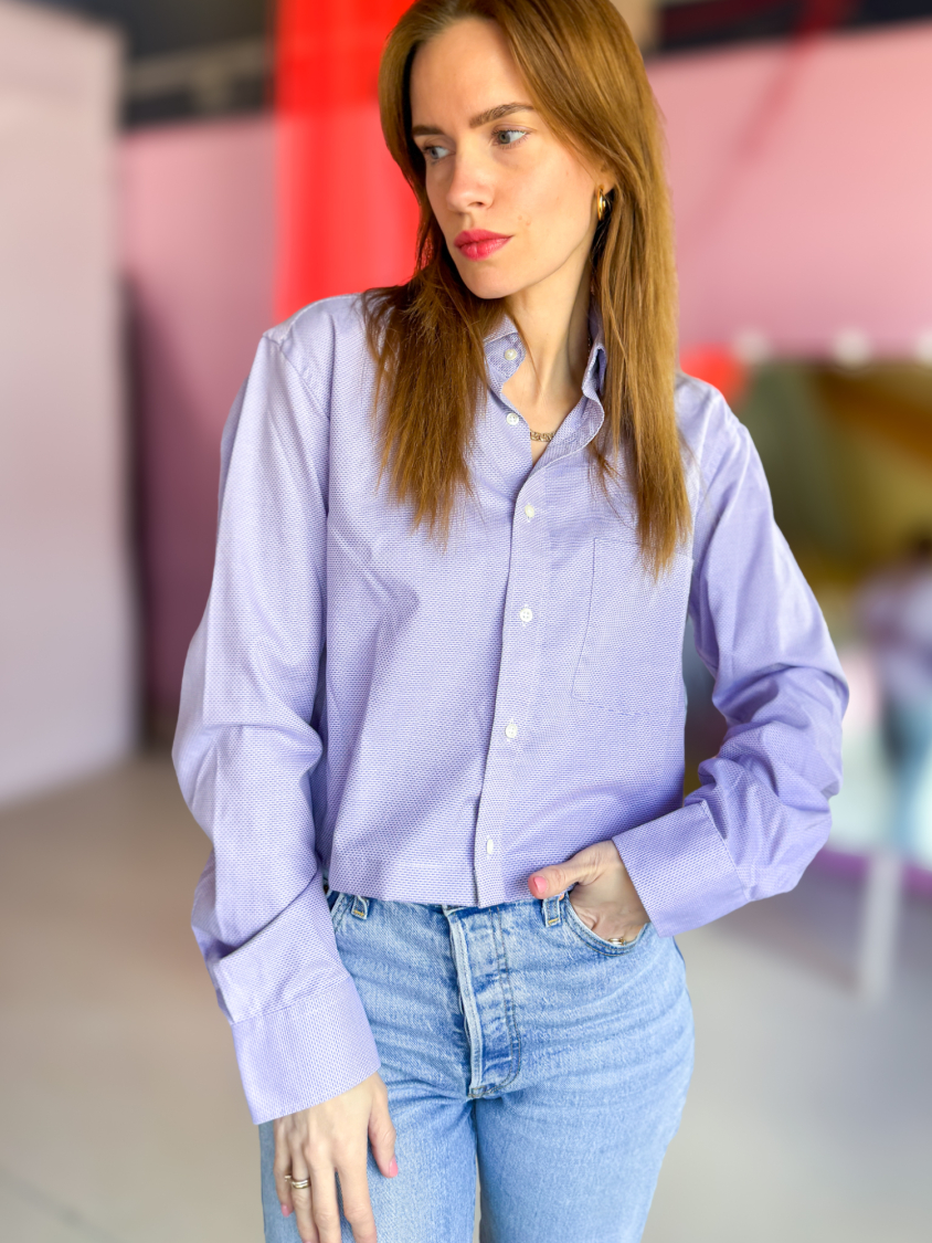 Vintage Vibes lilla mønstret skjorte med flæse - No 191 fra LÉ MOSCH, Smuk og feminin kort lilla skjorte, skjorte med flæse og lange ærmer,