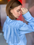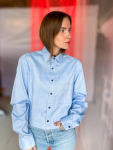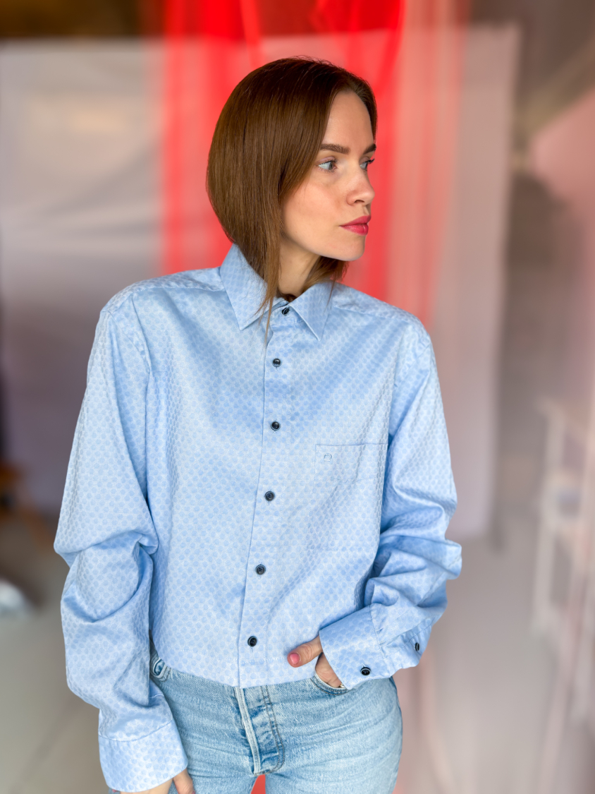 Vintage Vibes lyseblå skjorte med flæse - No 190 fra LÉ MOSCH, smuk og spændende kort lyseblå skjorte, skjorte med flæse og lange ærmer,