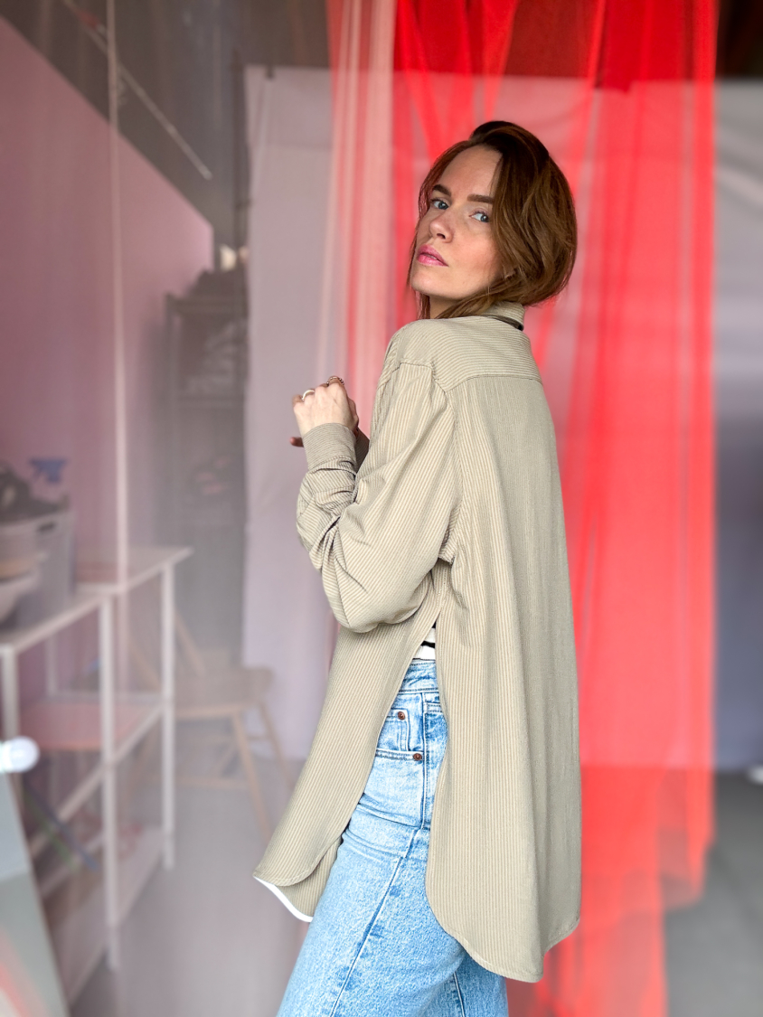Vintage Vibes mørk beige skjorte med slidser - No 200 fra LÉ MOSCH, cool og anderledes lys brun skjorte, one of a kind sommer-skjorte,