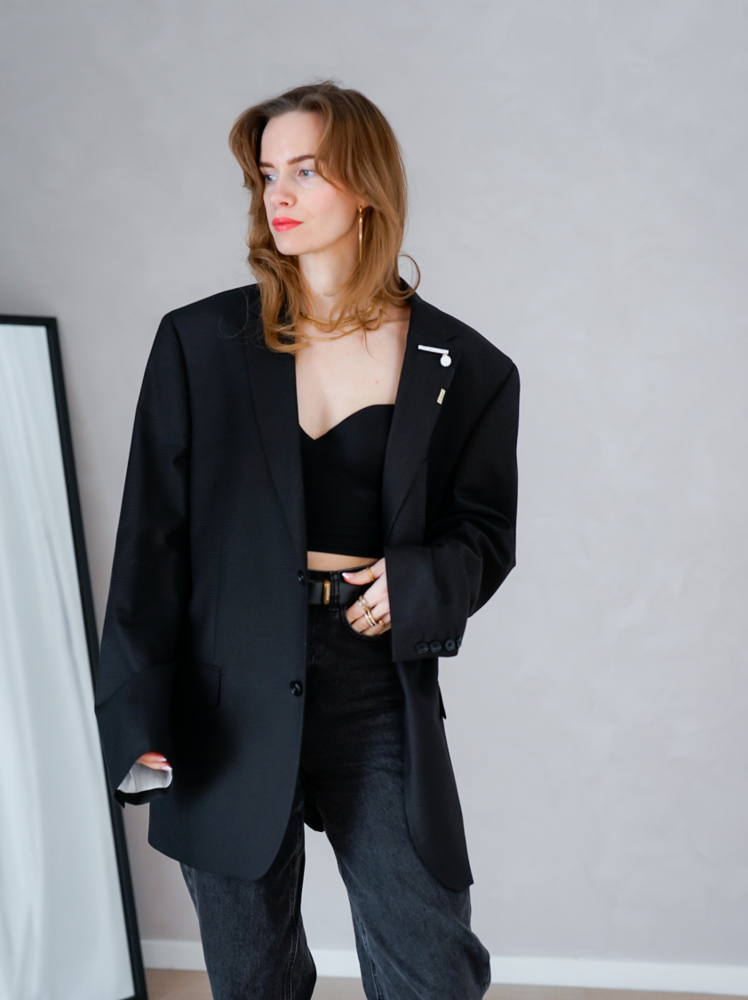 Vintage Vibes sort blazer med broche – No 156 fra LÉ MOSCH, skøn sort blazer med feminin broche med vedhæng, unik og enkel ternet sort oversize blazer,