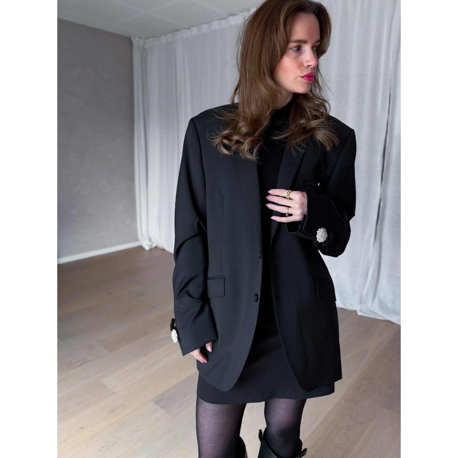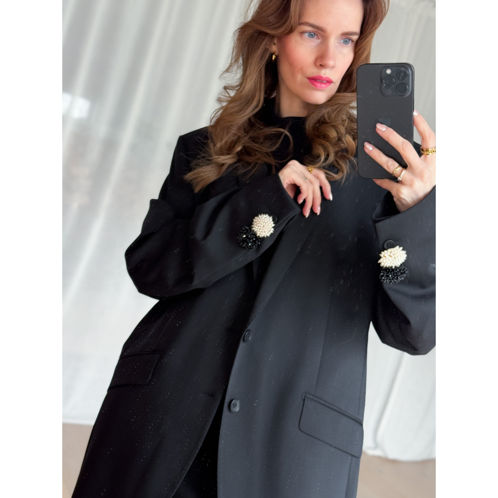 Blazeren er helt sort og har fået en lang slids i ryggen, som er toppet med en masse forskellige knapper. Vi har også sat lidt ekstra fint knap-pynt på ærmerne. Det giver alt i alt blazeren en fin og feminin vibe.