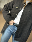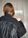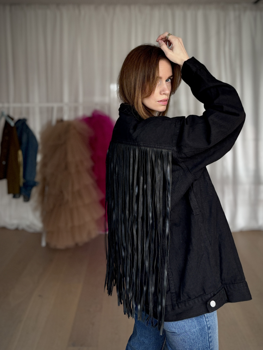 Vintage Vibes sort denim jakke med frynser – no 170 fra LÉ MOSCH, anvendelig denimjakke med lange frynser, sort anderledes denimjakke med frynselook,