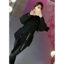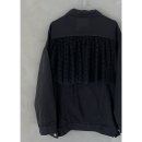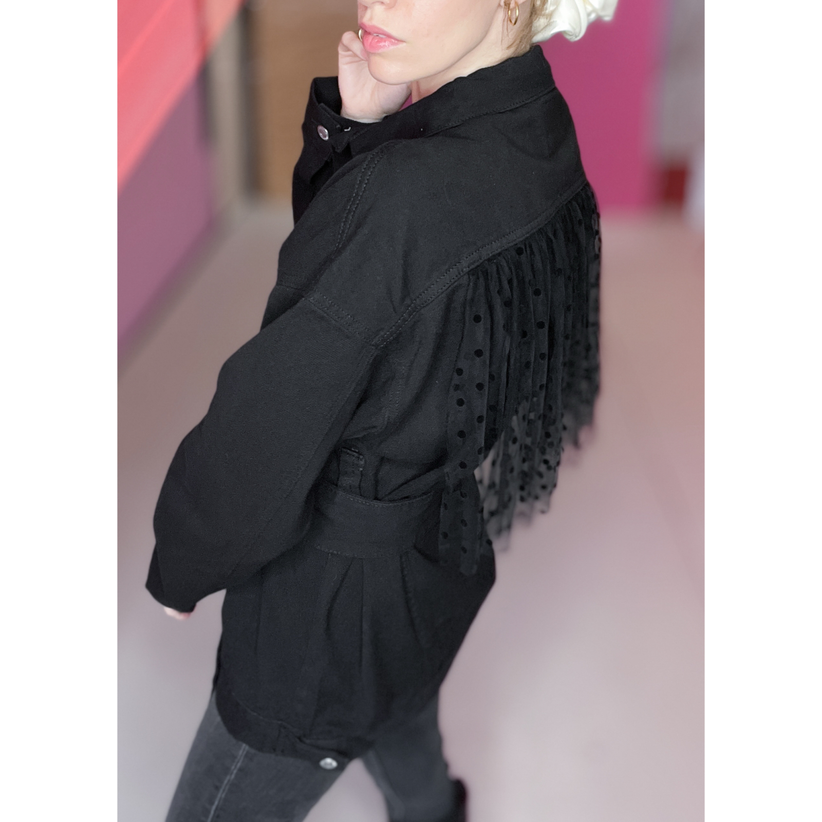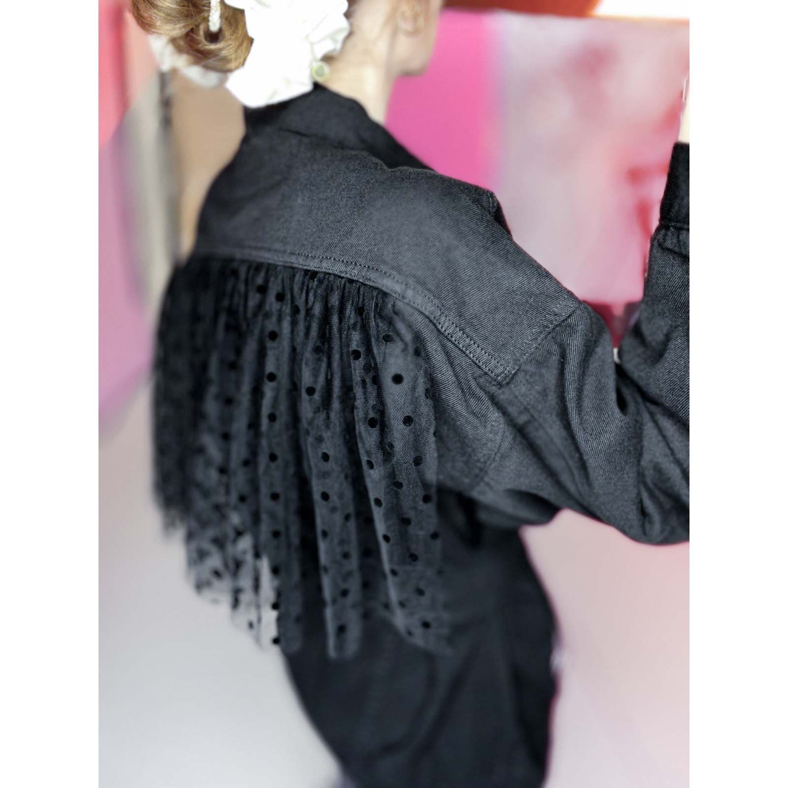 Denne sorte denim jakke er super skøn! Den har en dejlig længde, og så er den pyntet med prikket tyl på ryggen, påsat som en lang flæse. Vi elsker det! Der er kun meget få styk så hvis du kan li' den, så køb den! Der er i øvrigt et fedt bælte til jakken, med vores logo på.