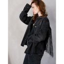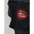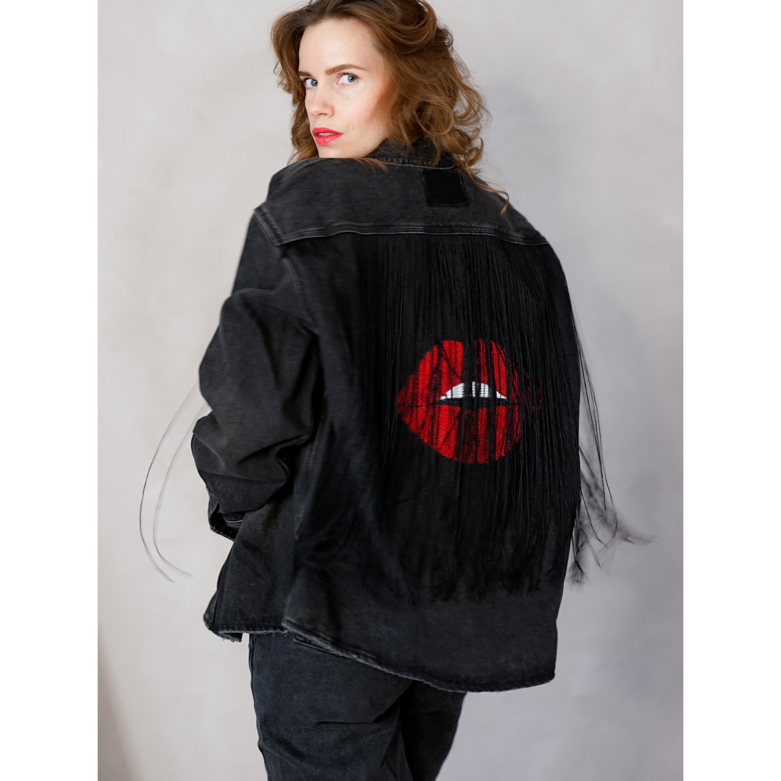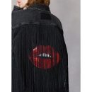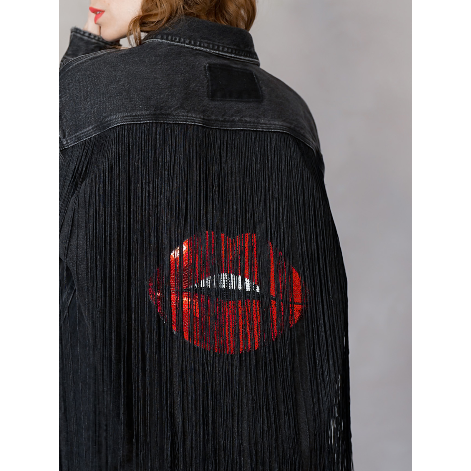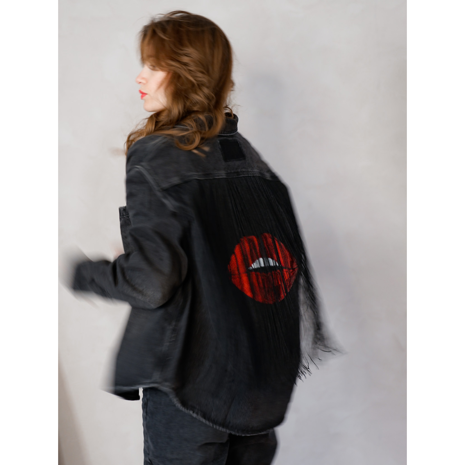 Frynser er en kæmpe trend og på denne sorte denimskjorte har vi twistet frynselooket med en skøn stor patch med shiny paillet-læber! Vildt lækkert look!