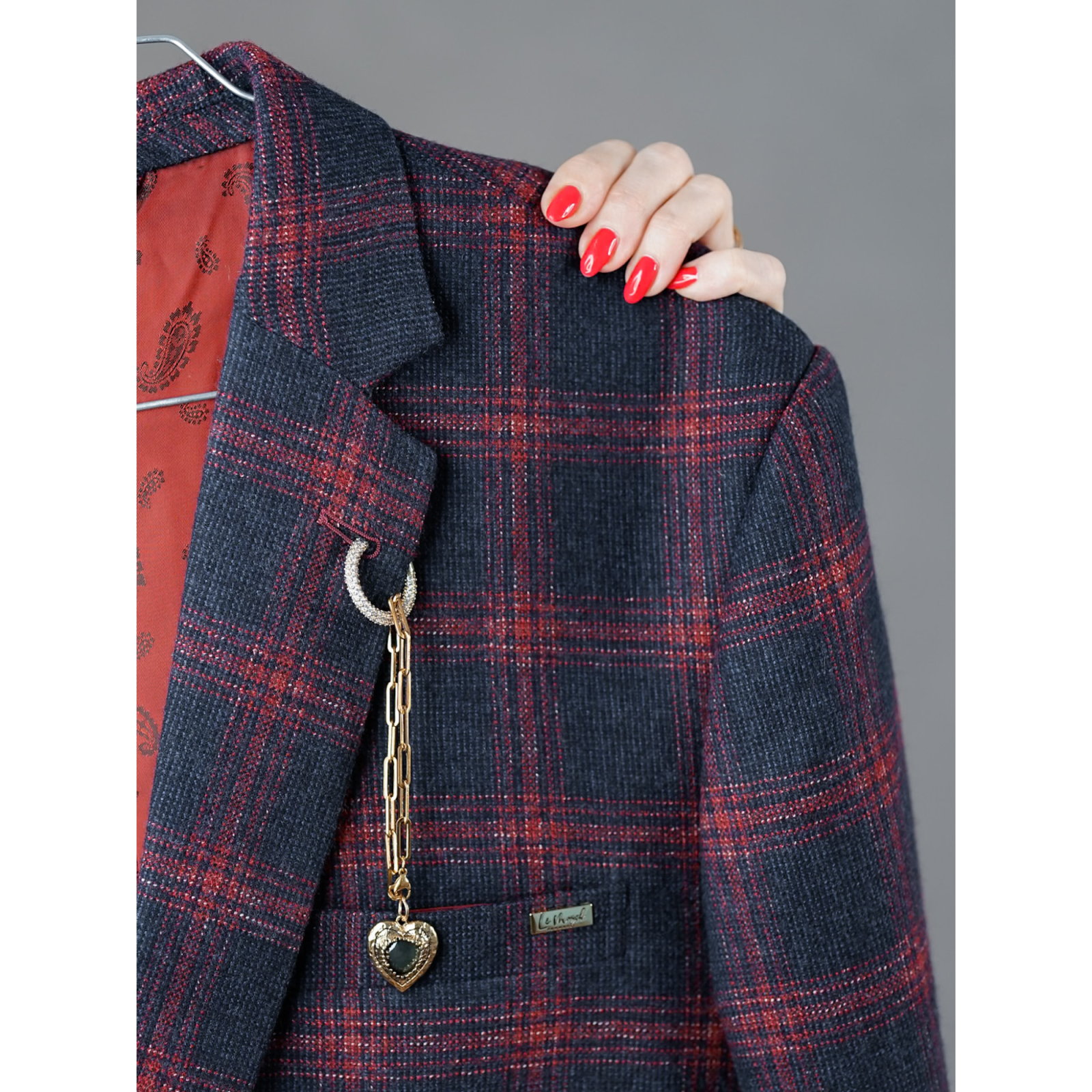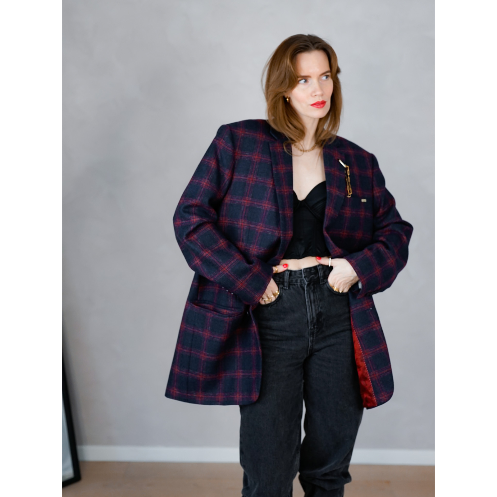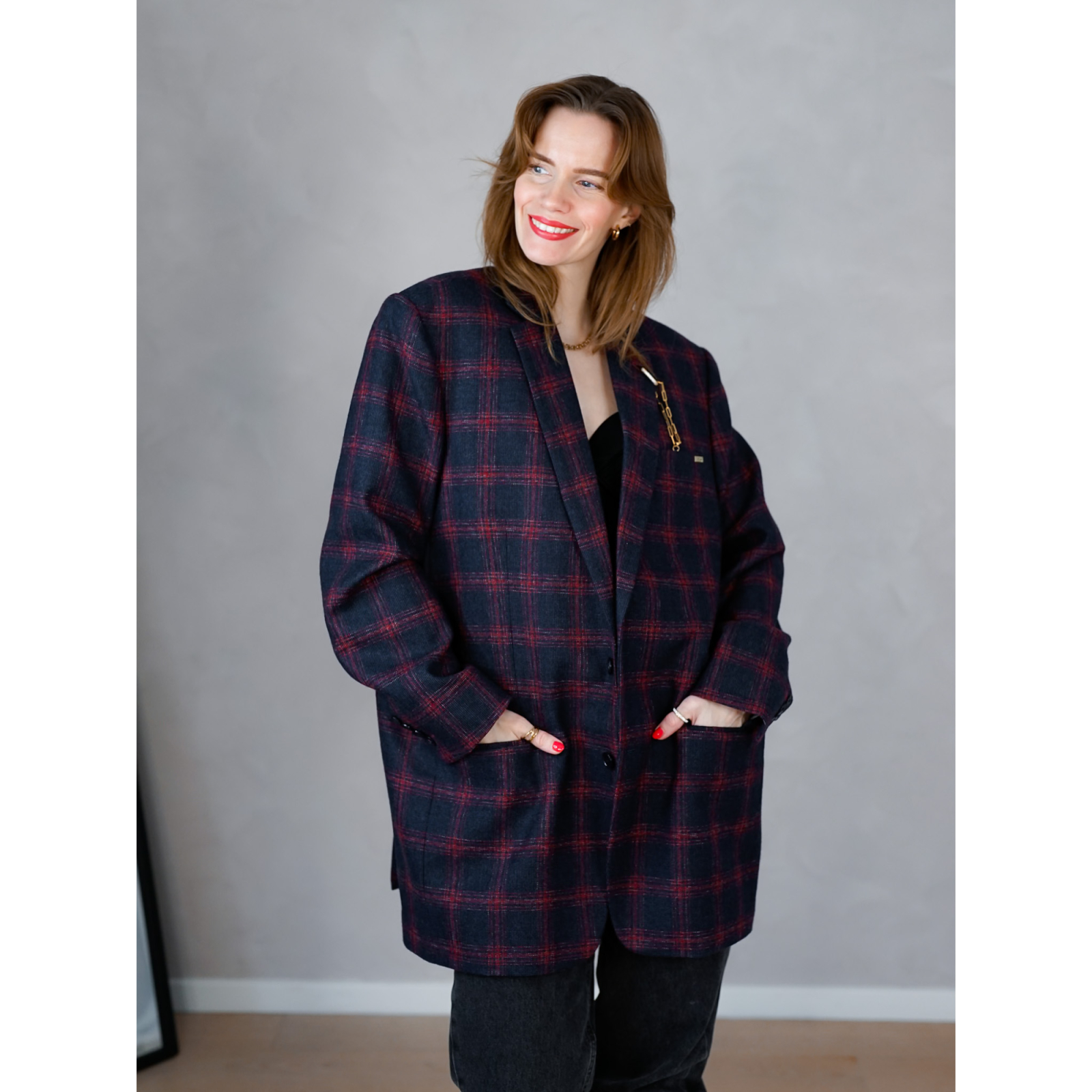 Denne secondhand blazer har skønne tern i rød og blå, og det finder vi ikke så ofte. Vi har pyntet den med en dekorativ kæde. Det giver blazeren en lidt finere og mere sofistikeret vibe. Du kan selvfølgelig tage kæden af og sætte den på noget andet lækkert i dit klædeskab.