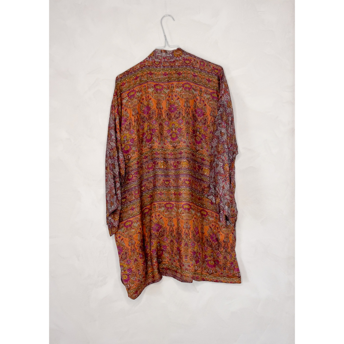 ONE SIZE (str 34-44) Kimonoen er produceret i silkemix. BEMÆRK at kimonoerne er produceret i vintage sarier, så der kan være små fejl fra den tidligere ejer af sarien så som fx mindre pletter, mindre huller, små tråde og print fejl! Men det er kun en del af charmen og historien.