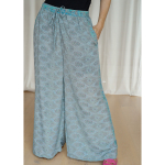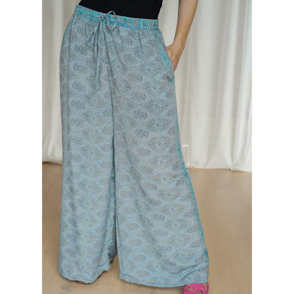 Unikke ONESIZE bukser med brede ben. BEMÆRK at bukserne er produceret i vintage sarier, så der kan være små fejl i materialet, som f.eks. mindre pletter, små trådfejl, små huller, lapper og print fejl.